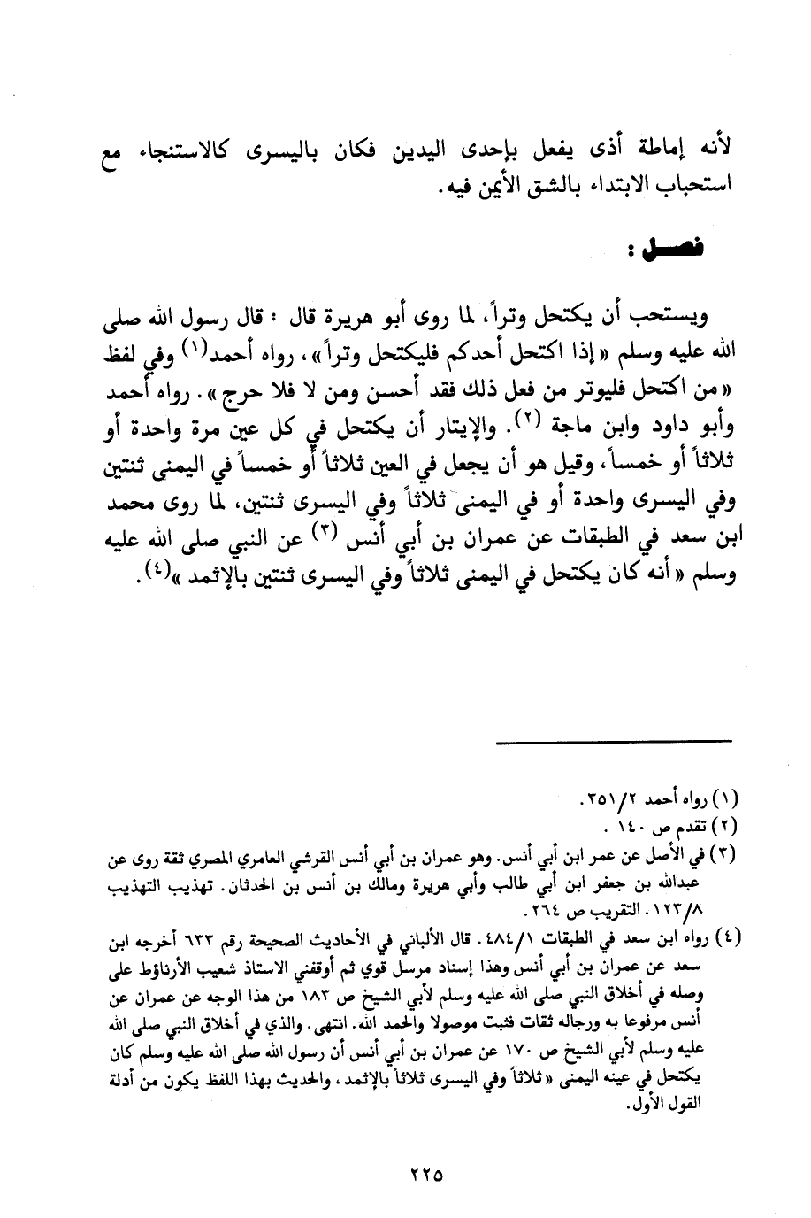 وَيُسْتَحَبُّ أَنْ يَكْتَحِلَ وِتْرًا؛ لِمَا رَوَى أَبُو هُرَيْرَةَ قَالَ: قَالَ رَسُولُ اللَّهِ صَلَّى اللَّهُ عَلَيْهِ وَسَلَّمَ: («إِذَا اكْتَحَلَ أَحَدُكُمْ فَلْيَكْتَحِلْ وِتْرًا») رَوَاهُ أَحْمَدُ، وَفِي لَفْظٍ: («مَنِ اكْتَحَلَ فَلْيُوتِرْ، مَنْ فَعَلَ ذَلِكَ فَقَدْ أَحْسَنَ، وَمَنْ لَا، فَلَا حَرَجَ») رَوَاهُ أَحْمَدُ وَأَبُو دَاوُدَ وَابْنُ مَاجَهْ، وَالْإِيتَارُ أَنْ يَكْتَحِلَ فِي كُلِّ عَيْنٍ مَرَّةً وَاحِدَةً، أَوْ ثَلَاثًا أَوْ خَمْسًا، وَقِيلَ: هُوَ أَنْ يَجْعَلَ فِي الْعَيْنِ ثَلَاثًا أَوْ خَمْسًا فِي الْيُمْنَى ثِنْتَيْنِ وَفِي الْيُسْرَى وَاحِدَةً، أَوْ فِي الْيُمْنَى ثَلَاثًا، وَفِي الْيُسْرَى ثِنْتَيْنِ؛ لِمَا رَوَى مُحَمَّدُ بْنُ سَعْدٍ فِي الطَّبَقَاتِ عَنْ عِمْرَانَ بْنِ أَبِي أَنَسٍ عَنِ النَّبِيِّ صَلَّى اللَّهُ عَلَيْهِ وَسَلَّمَ: («أَنَّهُ كَانَ يَكْتَحِلُ فِي الْيُمْنَى ثَلَاثًا، وَفِي الْيُسْرَى ثِنْتَيْنِ بِالْإِثْمِدِ»).