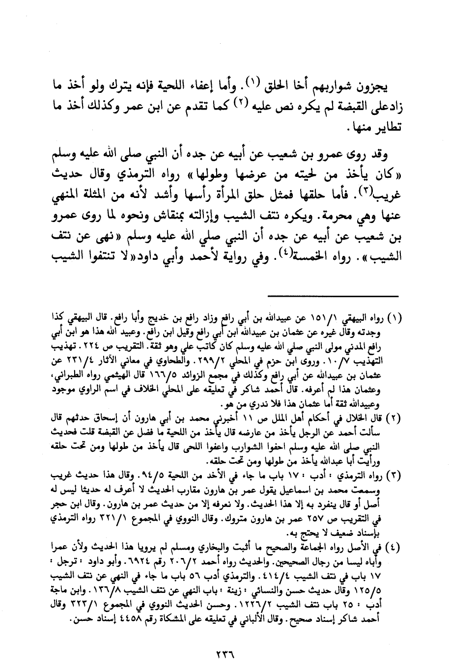 وَقَدْ رَوَى عَمْرُو بْنُ شُعَيْبٍ، عَنْ أَبِيهِ، عَنْ جَدِّهِ أَنَّ النَّبِيَّ صَلَّى اللَّهُ عَلَيْهِ وَسَلَّمَ («كَانَ يَأْخُذُ مِنْ لِحْيَتِهِ مِنْ عَرْضِهَا وَطُولِهَا») رَوَاهُ التِّرْمِذِيُّ، وَقَالَ: حَدِيثٌ غَرِيبٌ، فَأَمَّا حَلْقُهَا فَمِثْلُ حَلْقِ الْمَرْأَةِ رَأْسَهَا وَأَشَدُّ؛ لِأَنَّهُ مِنَ الْمُثْلَةِ الْمَنْهِيِّ عَنْهَا وَهِيَ مُحَرَّمَةٌ، وَيُكْرَهُ نَتْفُ الشَّيْبِ وَإِزَالَتُهُ بِمِنْقَاشٍ وَنَحْوِهِ؛ لِمَا رَوَى عَمْرُو بْنُ شُعَيْبٍ عَنْ أَبِيهِ عَنْ جَدِّهِ أَنَّ النَّبِيَّ صَلَّى اللَّهُ عَلَيْهِ وَسَلَّمَ: («نَهَى عَنْ نَتْفِ الشَّيْبِ») رَوَاهُ الْخَمْسَةُ، وَفِي رِوَايَةٍ لِأَحْمَدَ وَأَبِي دَاوُدَ: («لَا تَنْتِفُوا الشَّيْبَ