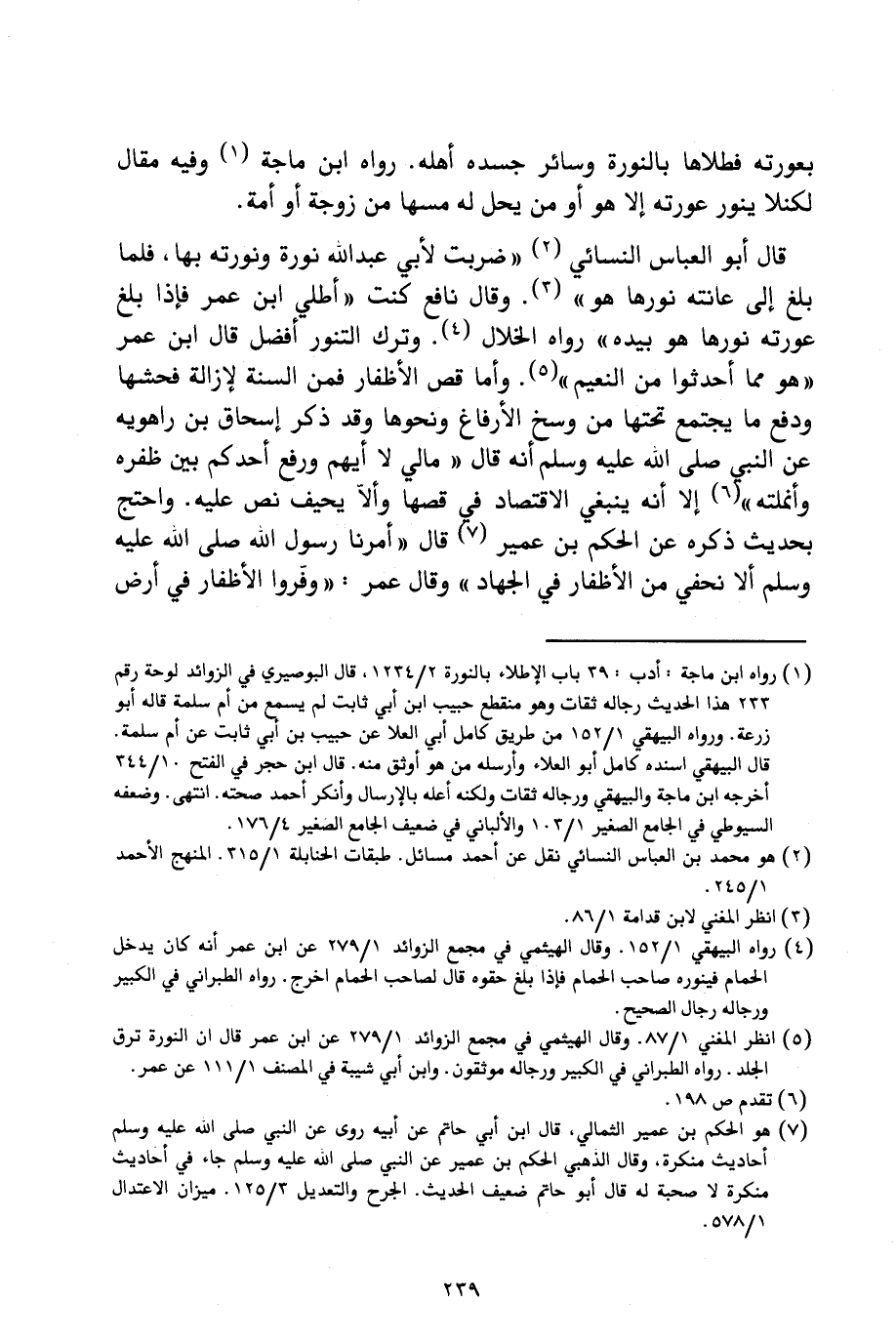 قَالَ أَبُو الْعَبَّاسِ النَّسَائِيُّ: " ضَرَبْتُ لِأَبِي عَبْدِ اللَّهِ نُورَةً وَنَوَّرْتُهُ بِهَا فَلَمَّا بَلَغَ إِلَى عَانَتِهِ نَوَّرَهَا هُوَ " وَقَالَ نَافِعٌ: " كُنْتُ أَطْلِي ابْنَ عُمَرَ فَإِذَا بَلَغَ عَوْرَتَهُ نَوَّرَهَا هُوَ بِيَدِهِ " رَوَاهُ الْخَلَّالُ، وَتَرْكُ التَّنُّورِ أَفْضَلُ، قَالَ ابْنُ عُمَرَ: " هُوَ مِمَّا أَحْدَثُوا مِنَ النَّعِيمِ " وَأَمَّا قَصُّ الْأَظْفَارِ فَمِنَ السُّنَّةِ لِإِزَالَةِ فُحْشِهَا وَدَفْعِ مَا يَجْتَمِعُ تَحْتَهَا مِنْ وَسَخِ الْأَرْفَاغِ وَنَحْوِهَا، وَقَدْ ذَكَرَ إِسْحَاقُ بْنُ رَاهَوَيْهِ عَنِ النَّبِيِّ صَلَّى اللَّهُ عَلَيْهِ وَسَلَّمَ أَنَّهُ قَالَ: («مَا لِي لَا أَهِمُ وَرُفْغُ أَحَدِكُمْ بَيْنَ ظُفْرِهِ وَأُنْمُلَتِهِ») إِلَّا أَنَّهُ يَنْبَغِي الِاقْتِصَادُ فِي قَصِّهَا وَأَلَّا يَحِيفَ، نَصَّ عَلَيْهِ، وَاحْتَجَّ بِحَدِيثٍ ذَكَرَهُ عَنِ الْحَكَمِ بْنِ عُمَيْرٍ قَالَ: («أَمَرَنَا رَسُولُ اللَّهِ صَلَّى اللَّهُ عَلَيْهِ وَسَلَّمَ أَلَّا نُحْفِيَ مِنَ الْأَظْفَارِ فِي الْجِهَادِ») وَقَالَ عُمَرُ: " وَفِّرُوا الْأَظْفَارَ فِي أَرْضِ