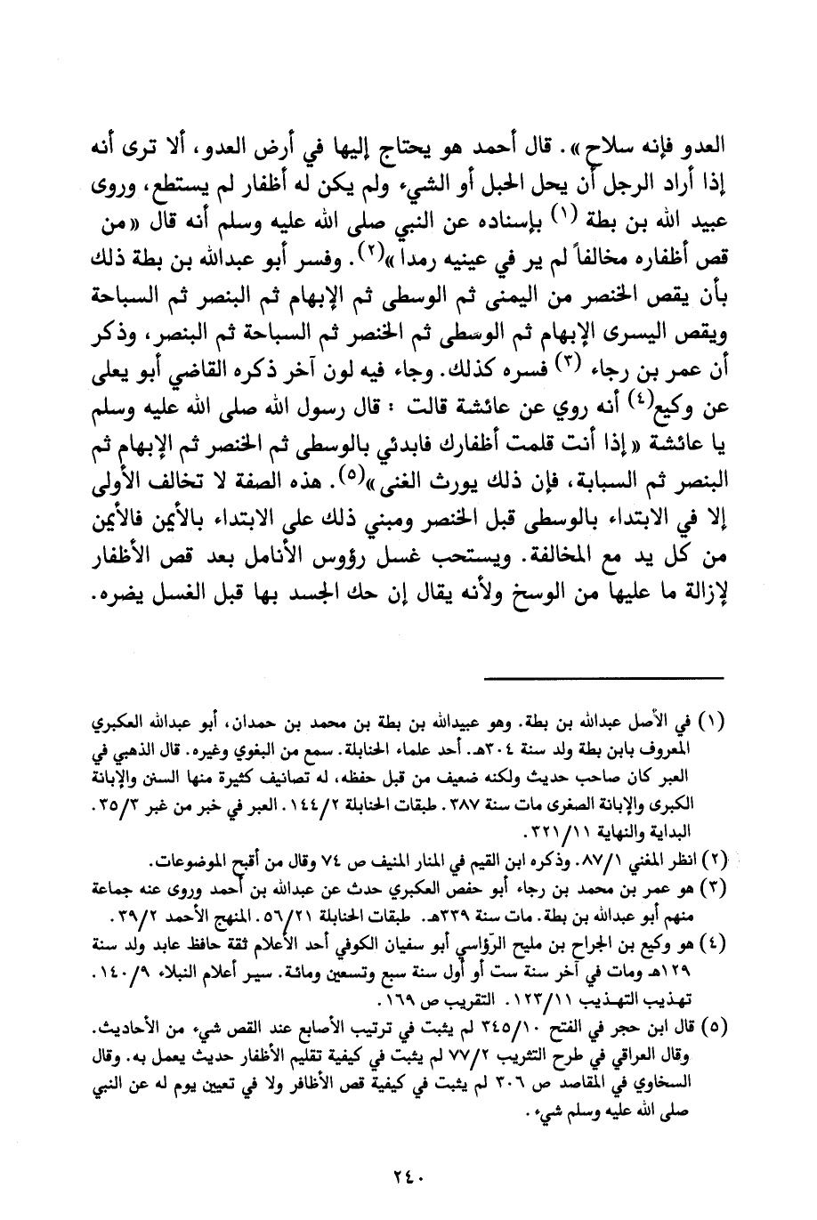 الْعَدُوِّ فَإِنَّهُ سِلَاحٌ " قَالَ أَحْمَدُ: هُوَ يَحْتَاجُ إِلَيْهَا فِي أَرْضِ الْعَدُوِّ، أَلَا تَرَى أَنَّهُ إِذَا أَرَادَ الرَّجُلُ أَنْ يَحُلَّ الْحَبْلَ أَوِ الشَّيْءَ وَلَمْ يَكُنْ لَهُ أَظْفَارٌ لَمْ يَسْتَطِعْ، وَرَوَى عُبَيْدُ اللَّهِ بْنُ بَطَّةَ بِإِسْنَادِهِ عَنِ النَّبِيِّ صَلَّى اللَّهُ عَلَيْهِ وَسَلَّمَ أَنَّهُ قَالَ: («مَنْ قَصَّ أَظْفَارَهُ مُخَالِفًا لَمْ يَرَ فِي عَيْنَيْهِ رَمَدًا») وَفَسَّرَ أَبُو عَبْدِ اللَّهِ بْنُ بَطَّةَ ذَلِكَ بِأَنْ يَقُصَّ الْخِنْصَرَ مِنَ الْيُمْنَى ثُمَّ الْوُسْطَى ثُمَّ الْإِبْهَامَ ثُمَّ الْبِنْصِرَ ثُمَّ السَّبَّاحَةَ وَيَقُصَّ الْيُسْرَى الْإِبْهَامَ ثُمَّ الْوُسْطَى ثُمَّ الْخِنْصَرَ ثُمَّ السَّبَّاحَةَ ثُمَّ الْبِنْصِرَ، وَذَكَرَ أَنَّ عُمَرَ بْنَ رَجَاءٍ فَسَّرَهُ كَذَلِكَ، وَجَاءَ فِيهِ لَوْنٌ آخَرُ ذَكَرَهُ الْقَاضِي أَبُو يَعْلَى عَنْ وَكِيعٍ أَنَّهُ رُوِيَ عَنْ عَائِشَةَ قَالَتْ: قَالَ رَسُولُ اللَّهِ صَلَّى اللَّهُ عَلَيْهِ وَسَلَّمَ: («يَا عَائِشَةُ إِذَا أَنْتِ قَلَّمْتِ أَظْفَارَكِ فَابْدَئِي بِالْوُسْطَى ثُمَّ الْخِنْصَرِ ثُمَّ الْإِبْهَامِ ثُمَّ الْبِنْصِرِ ثُمَّ السَّبَّابَةِ، فَإِنَّ ذَلِكَ يُورِثُ الْغِنَى») هَذِهِ الصِّفَةُ لَا تُخَالِفُ الْأُولَى إِلَّا فِي الِابْتِدَاءِ بِالْوُسْطَى قَبْلَ الْخِنْصَرِ، وَمَبْنَى ذَلِكَ عَلَى الِابْتِدَاءِ بِالْأَيْمَنِ فَالْأَيْمَنِ مِنْ كُلِّ يَدٍ مَعَ الْمُخَالَفَةِ، وَيُسْتَحَبُّ غَسْلُ رُءُوسِ الْأَنَامِلِ بَعْدَ قَصِّ الْأَظْفَارِ لِإِزَالَةِ مَا عَلَيْهَا مِنَ الْوَسَخِ؛ وَلِأَنَّهُ يُقَالُ: إِنَّ حَكَّ الْجَسَدِ بِهَا قَبْلَ الْغَسْلِ يَضُرُّهُ.