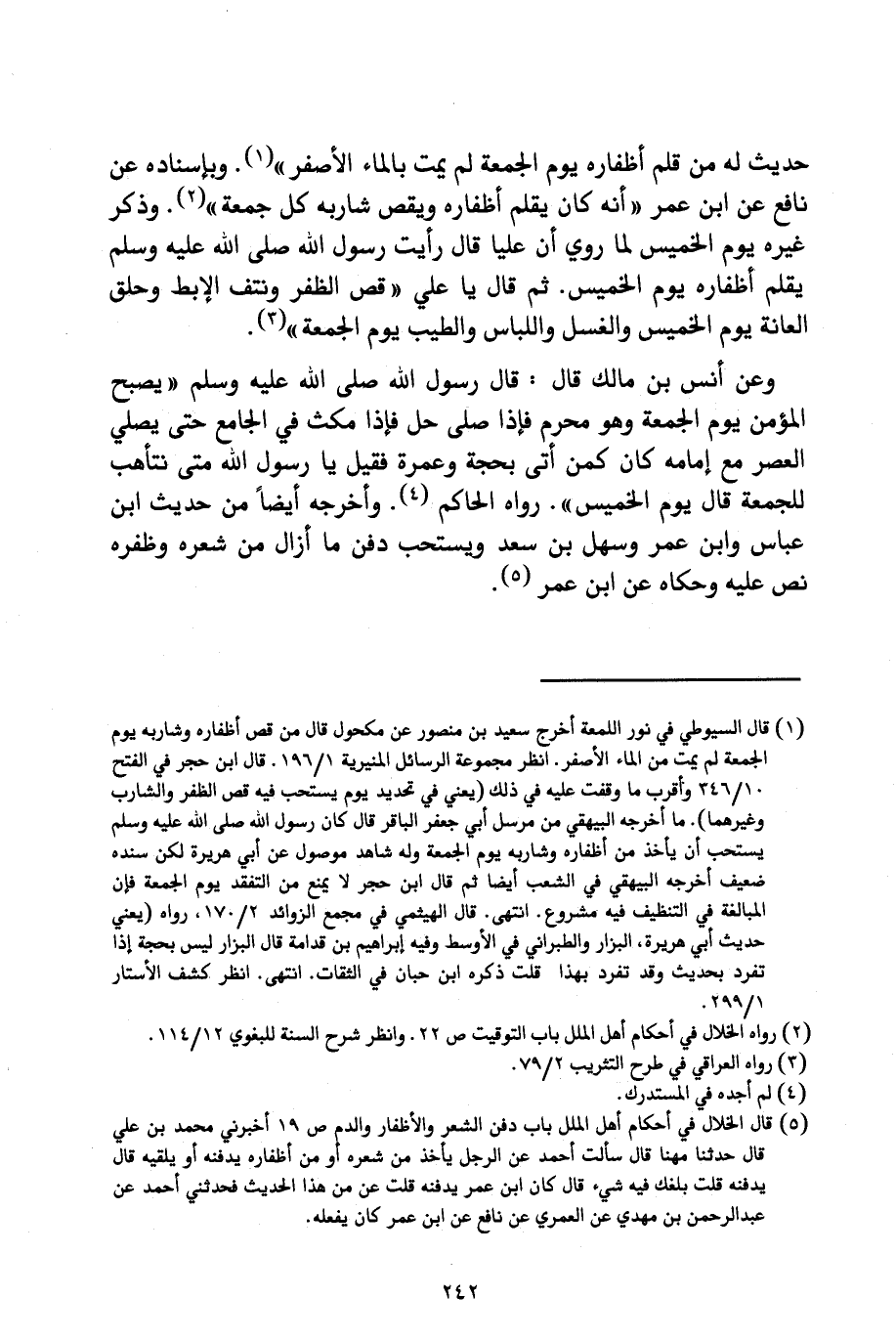 وَعَنْ أَنَسِ بْنِ مَالِكٍ قَالَ: قَالَ رَسُولُ اللَّهِ صَلَّى اللَّهُ عَلَيْهِ وَسَلَّمَ: («يُصْبِحُ الْمُؤْمِنُ يَوْمَ الْجُمْعَةِ وَهُوَ مُحْرِمٌ فَإِذَا صَلَّى حَلَّ فَإِذَا مَكَثَ فِي الْجَامِعِ حَتَّى يُصَلِّيَ الْعَصْرَ مَعَ إِمَامِهِ كَانَ كَمَنْ أَتَى بِحَجَّةٍ وَعُمْرَةٍ، فَقِيلَ: يَا رَسُولَ اللَّهِ مَتَى نَتَأَهَّبُ لِلْجُمْعَةِ؟ قَالَ: يَوْمَ الْخَمِيسِ») رَوَاهُ الْحَاكِمُ، وَأَخْرَجَهُ أَيْضًا مِنْ حَدِيثِ ابْنِ عَبَّاسٍ وَابْنِ عُمَرَ وَسَهْلِ بْنِ سَعْدٍ، وَيُسْتَحَبُّ دَفْنُ مَا أَزَالَ مِنْ شِعْرِهِ وَظُفْرِهِ، نَصَّ عَلَيْهِ وَحَكَاهُ عَنِ ابْنِ عُمَرَ.