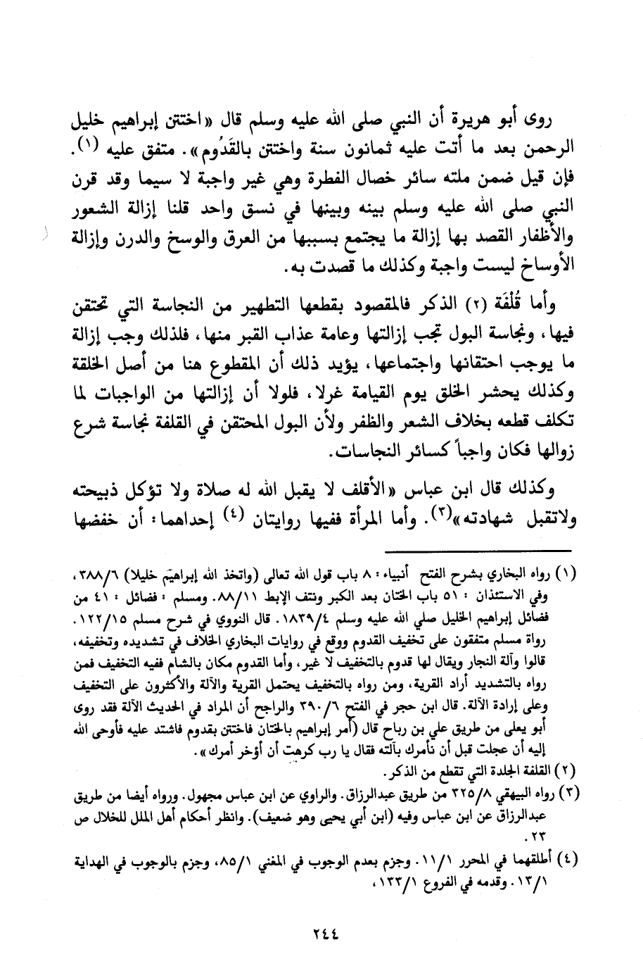 رَوَى أَبُو هُرَيْرَةَ أَنَّ النَّبِيَّ صَلَّى اللَّهُ عَلَيْهِ وَسَلَّمَ قَالَ: («اخْتَتَنَ إِبْرَاهِيمُ خَلِيلُ الرَّحْمَنِ بَعْدَ مَا أَتَتْ عَلَيْهِ ثَمَانُونَ سَنَةً وَاخْتَتَنَ بِالْقَدُومِ») مُتَّفَقٌ عَلَيْهِ، فَإِنْ قِيلَ: ضَمَّنَ مِلَّتَهُ سَائِرَ خِصَالِ الْفِطْرَةِ وَهِيَ غَيْرُ وَاجِبَةٍ لَا سِيَّمَا وَقَدْ قَرَنَ النَّبِيُّ صَلَّى اللَّهُ عَلَيْهِ وَسَلَّمَ بَيْنَهُ وَبَيْنَهَا فِي نَسَقٍ وَاحِدٍ، قُلْنَا: إِزَالَةُ الشُّعُورِ وَالْأَظْفَارِ الْقَصْدُ بِهَا إِزَالَةُ مَا يَجْتَمِعُ بِسَبَبِهَا مِنَ الْعَرَقِ وَالْوَسَخِ وَالدَّرَنِ، وَإِزَالَةُ الْأَوْسَاخِ لَيْسَتْ وَاجِبَةً وَكَذَلِكَ مَا قُصِدَتْ بِهِ.