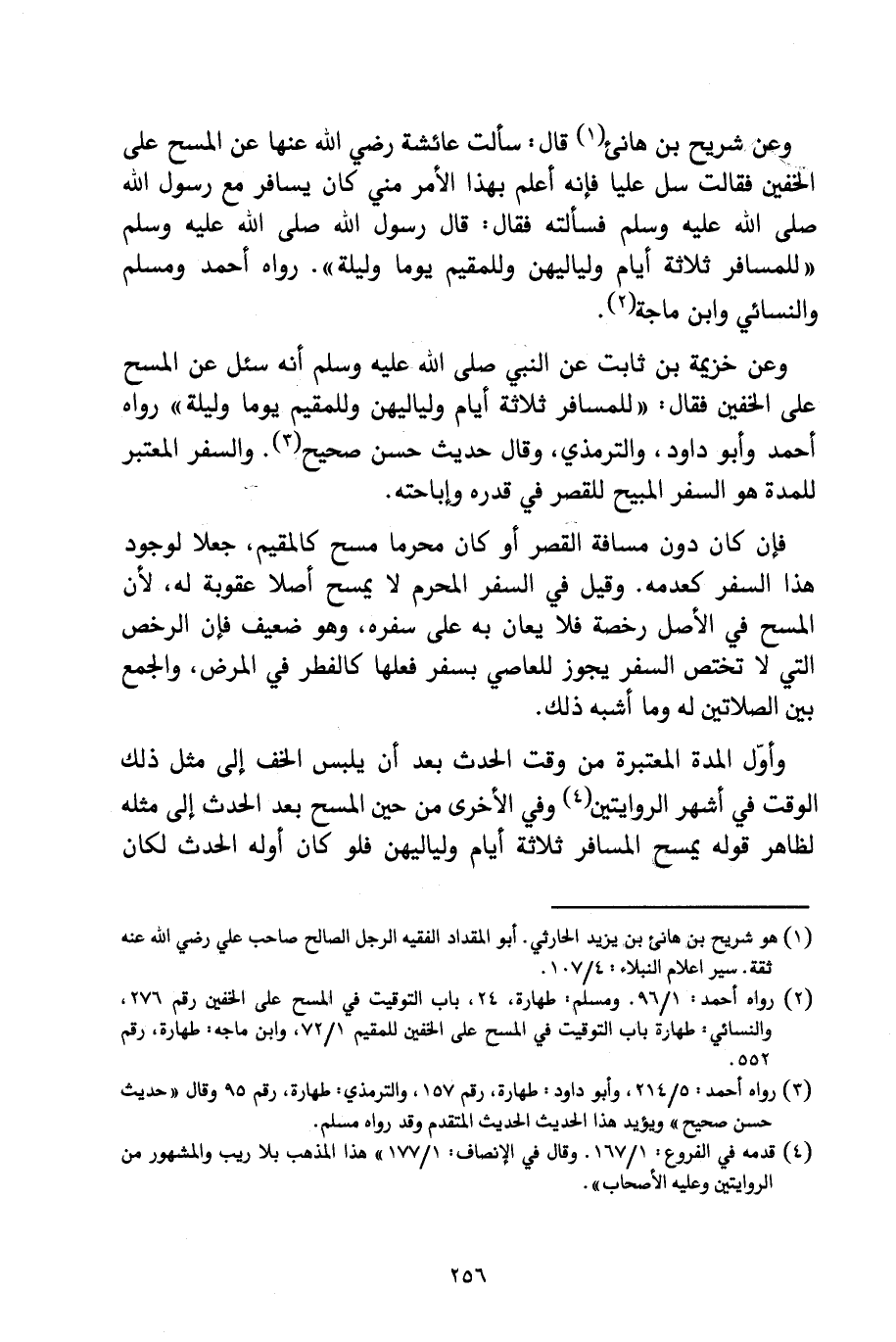 وَعَنْ شُرَيْحِ بْنِ هَانِئٍ قَالَ: «سَأَلْتُ عَائِشَةَ رَضِيَ اللَّهُ عَنْهَا عَنِ الْمَسْحِ عَلَى الْخُفَّيْنِ فَقَالَتْ: سَلْ عَلِيًّا فَإِنَّهُ أَعْلَمُ بِهَذَا الْأَمْرِ مِنِّي كَانَ يُسَافِرُ مَعَ رَسُولِ اللَّهِ صَلَّى اللَّهُ عَلَيْهِ وَسَلَّمَ فَسَأَلْتُهُ فَقَالَ: قَالَ رَسُولُ اللَّهِ صَلَّى اللَّهُ عَلَيْهِ وَسَلَّمَ: (لِلْمُسَافِرِ ثَلَاثَةُ أَيَّامٍ وَلَيَالِيهِنَّ وَلِلْمُقِيمِ يَوْمٌ وَلَيْلَةٌ») رَوَاهُ أَحْمَدُ وَمُسْلِمٌ وَالنَّسَائِيُّ وَابْنُ مَاجَهْ.