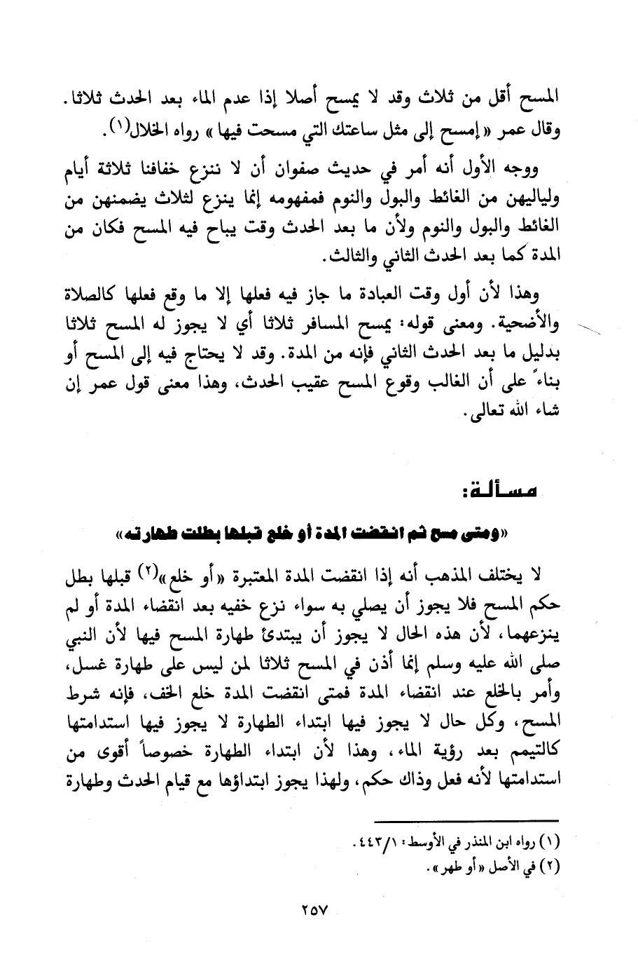 الْمَسْحُ أَقَلَّ مِنْ ثَلَاثٍ وَقَدْ لَا يُمْسَحُ أَصْلًا إِذَا عَدِمَ الْمَاءَ بَعْدَ الْحَدَثِ ثَلَاثًا، وَقَالَ عُمَرُ: " امْسَحْ إِلَى مِثْلِ سَاعَتِكَ الَّتِي مَسَحْتَ فِيهَا " رَوَاهُ الْخَلَّالُ.
