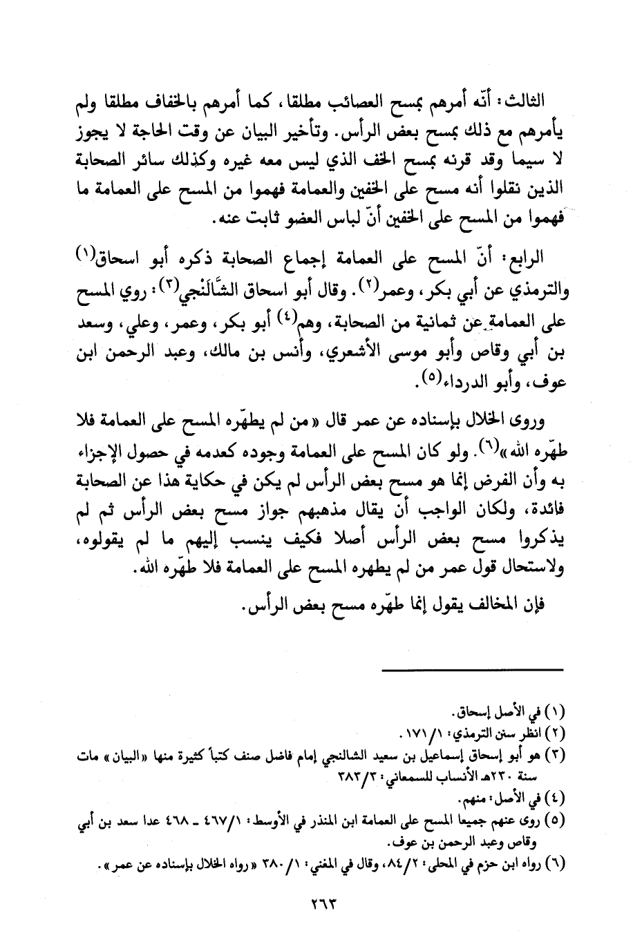 الرَّابِعُ: أَنَّ الْمَسْحَ عَلَى الْعِمَامَةِ إِجْمَاعُ الصَّحَابَةِ، ذَكَرَهُ أَبُو إِسْحَاقَ وَالتِّرْمِذِيُّ عَنْ أَبِي بَكْرٍ وَعُمَرَ، وَقَالَ أَبُو إِسْحَاقَ الشَّالَنْجِيُّ: رُوِيَ الْمَسْحُ عَلَى الْعِمَامَةِ عَنْ ثَمَانِيَةٍ مِنَ الصَّحَابَةِ، وَهُمْ أَبُو بَكْرٍ وَعُمَرُ وَعَلِيٌّ وَسَعْدُ بْنُ أَبِي وَقَّاصٍ وَأَبُو مُوسَى الْأَشْعَرِيُّ وَأَنَسُ بْنُ مَالِكٍ وَعَبْدُ الرَّحْمَنِ بْنُ عَوْفٍ وَأَبُو الدَّرْدَاءِ.