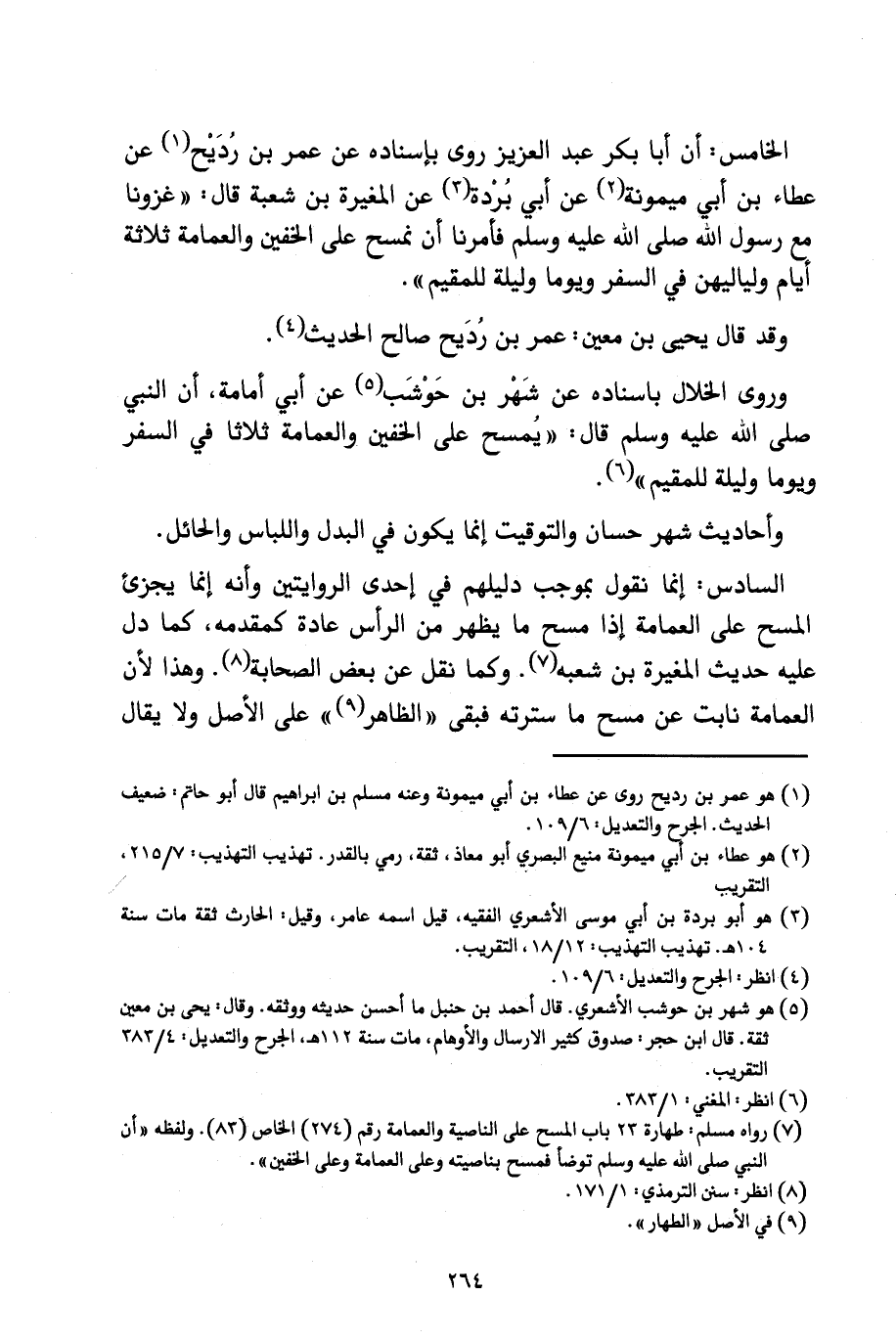 الْخَامِسُ: أَنَّ أَبَا بَكْرٍ عَبْدَ الْعَزِيزِ رَوَى بِإِسْنَادِهِ عَنْ عُمَرَ بْنِ رُدَيْحٍ عَنْ عَطَاءِ بْنِ أَبِي مَيْمُونَةَ عَنْ أَبِي بُرْدَةَ «عَنِ الْمُغِيرَةِ بْنِ شُعْبَةَ قَالَ: " غَزَوْنَا مَعَ رَسُولِ اللَّهِ صَلَّى اللَّهُ عَلَيْهِ وَسَلَّمَ فَأَمَرَنَا أَنْ نَمْسَحَ عَلَى الْخُفَّيْنِ وَالْعِمَامَةِ ثَلَاثَةَ أَيَّامٍ وَلَيَالِيهِنَّ فِي السَّفَرِ وَيَوْمًا وَلَيْلَةً لِلْمُقِيمِ».