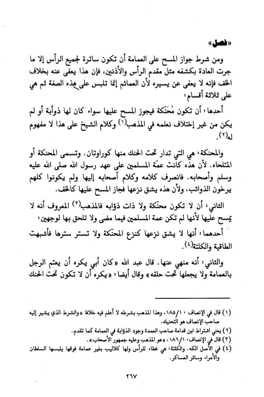 وَالثَّانِي: أَنَّهُ مَنْهِيٌّ عَنْهَا، قَالَ عَبْدُ اللَّهِ " كَانَ أَبِي يَكْرَهُ أَنْ يَعْتَمَّ الرَّجُلُ بِالْعِمَامَةِ وَلَا يَجْعَلَهَا تَحْتَ حَلْقِهِ " وَقَالَ أَيْضًا: " يُكْرَهُ أَنْ لَا تَكُونَ تَحْتَ الْحَنَكِ