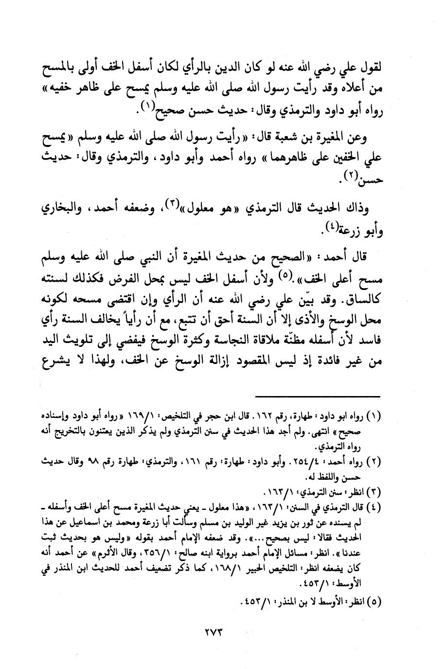 «لِقَوْلِ عَلِيٍّ رَضِيَ اللَّهُ عَنْهُ: لَوْ كَانَ الدِّينُ بِالرَّأْيِ لَكَانَ أَسْفَلُ الْخُفِّ أَوْلَى بِالْمَسْحِ مِنْ أَعْلَاهُ، وَقَدْ رَأَيْتُ رَسُولَ اللَّهِ صَلَّى اللَّهُ عَلَيْهِ وَسَلَّمَ يَمْسَحُ عَلَى ظَاهِرِ خُفَّيْهِ» رَوَاهُ أَبُو دَاوُدَ وَالتِّرْمِذِيُّ وَقَالَ: حَدِيثٌ حَسَنٌ صَحِيحٌ.