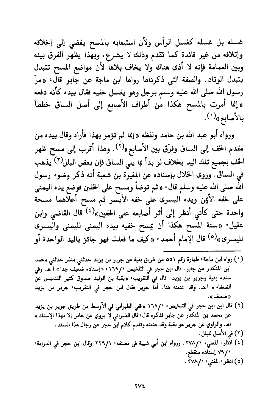 وَرَوَاهُ أَبُو عَبْدِ اللَّهِ بْنُ حَامِدٍ وَلَفْظُهُ " «إِنَّمَا لَمْ تُؤْمَرْ بِهَذَا فَأَرَاهُ وَقَالَ بِيَدِهِ مِنْ مُقَدَّمِ الْخُفِّ إِلَى السَّاقِ وَفَرَّقَ بَيْنَ الْأَصَابِعِ» " وَهَذَا أَقْرَبُ إِلَى مَسْحِ ظَهْرِ الْخُفِّ بِجَمِيعِ تِلْكَ الْيَدِ؛ بِخِلَافِ لَوْ بَدَأَ بِمَا يَلِي السَّاقَ فَإِنَّ بَعْضَ الْبَلَلِ يَذْهَبُ فِي السَّاقِ، وَرَوَى الْخَلَّالُ بِإِسْنَادِهِ عَنِ الْمُغِيرَةِ بْنِ شُعْبَةَ أَنَّهُ ذَكَرَ وُضُوءَ رَسُولِ اللَّهِ صَلَّى اللَّهُ عَلَيْهِ وَسَلَّمَ قَالَ: " «ثُمَّ تَوَضَّأَ وَمَسَحَ عَلَى الْخُفَّيْنِ فَوَضَعَ يَدَهُ الْيُمْنَى عَلَى خُفِّهِ الْأَيْمَنِ وَيَدَهُ الْيُسْرَى عَلَى خُفِّهِ الْأَيْسَرِ، ثُمَّ مَسَحَ أَعْلَاهُمَا مَسْحَةً وَاحِدَةً حَتَّى كَأَنِّي أَنْظُرُ إِلَى أَثَرِ أَصَابِعِهِ عَلَى الْخُفَّيْنِ» " قَالَ الْقَاضِي وَابْنُ عَقِيلٍ: " سُنَّةُ الْمَسْحِ هَكَذَا أَنْ يَمْسَحَ خُفَّيْهِ بِيَدِهِ الْيُمْنَى لِلْيُمْنَى وَالْيُسْرَى لِلْيُسْرَى " قَالَ الْإِمَامُ أَحْمَدُ: " كَيْفَ مَا فَعَلْتَ فَهُو جَائِزٌ بِالْيَدِ الْوَاحِدَةِ أَوْ
