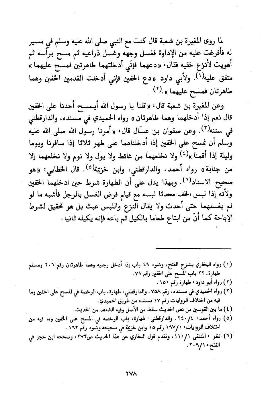«وَعَنِ الْمُغِيرَةِ بْنِ شُعْبَةَ قَالَ: " قُلْنَا يَا رَسُولَ اللَّهِ أَيَمْسَحُ أَحَدُنَا عَلَى الْخُفَّيْنِ؟ قَالَ: نَعَمْ إِذَا أَدْخَلَهُمَا وَهُمَا طَاهِرَتَانِ» رَوَاهُ الْحُمَيْدِيُّ فِي مُسْنَدِهِ وَالدَّارَقُطْنِيُّ فِي سُنَنِهِ، «وَعَنْ صَفْوَانَ بْنِ عَسَّالٍ قَالَ: " أَمَرَنَا رَسُولُ اللَّهِ صَلَّى اللَّهُ عَلَيْهِ وَسَلَّمَ أَنْ نَمْسَحَ عَلَى الْخُفَّيْنِ إِذَا أَدْخَلْنَاهُمَا عَلَى طُهْرٍ ثَلَاثًا إِذَا سَافَرْنَا، وَيَوْمًا وَلَيْلَةً إِذَا أَقَمْنَا " وَلَا نَخْلَعَهُمَا مِنْ غَائِطٍ وَلَا بَوْلٍ وَلَا نَخْلَعَهُمَا إِلَّا مِنْ جَنَابَةٍ» رَوَاهُ أَحْمَدُ وَالدَّارَقُطْنِيُّ وَابْنُ خُزَيْمَةَ، قَالَ الْخَطَّابِيُّ: " هُوَ صَحِيحُ الْإِسْنَادِ، وَبِهَذَا يَدُلُّ عَلَى أَنَّ الطَّهَارَةَ شَرْطٌ حِينَ أَدْخَلَهُمَا الْخُفَّيْنِ؛ وَلِأَنَّهُ إِذَا لَبِسَ الْخُفَّ مُحْدِثًا لَبِسَهُ مَعَ قِيَامِ فَرْضِ الْغَسْلِ بِالرِّجْلِ فَأَشْبَهَ مَا لَوْ لَمْ يَغْسِلْهُمَا حَتَّى أَحْدَثَ، وَلَا يُقَالُ النَّزْعُ وَاللُّبْسُ عَبَثٌ بَلْ هُوَ تَحْقِيقٌ لِشَرْطِ الْإِبَاحَةِ كَمَا أَنَّ مَنِ ابْتَاعَ طَعَامًا بِالْكَيْلِ ثُمَّ بَاعَهُ فَإِنَّهُ يَكِيلُهُ ثَانِيًا.