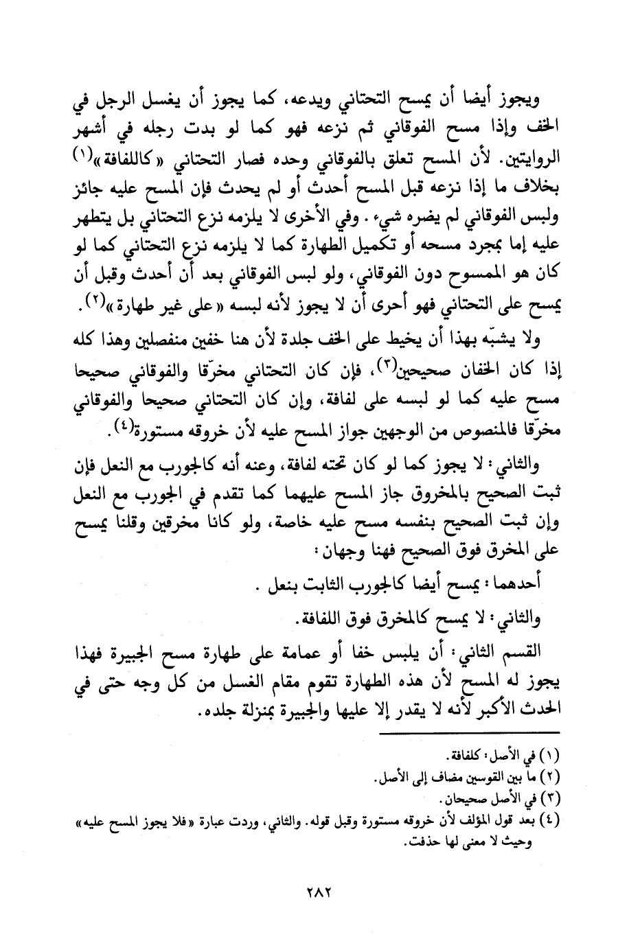 وَيَجُوزُ أَيْضًا أَنْ يَمْسَحَ التَّحْتَانِيَّ وَيَدَعَهُ، كَمَا يَجُوزُ أَنْ يَغْسِلَ الرِّجْلَ فِي الْخُفِّ، وَإِذَا مَسَحَ الْفَوْقَانِيَّ ثُمَّ نَزَعَهُ فَهُوَ كَمَا لَوْ بَدَتْ رِجْلُهُ فِي أَشْهَرِ الرِّوَايَتَيْنِ؛ لَأَنَّ الْمَسْحَ تَعَلَّقَ بِالْفَوْقَانِيِّ وَحْدَهُ فَصَارَ التَّحْتَانِيُّ " كَاللِّفَافَةِ " بِخِلَافِ مَا إِذَا نَزَعَهُ قَبْلَ الْمَسْحِ أَحْدَثَ أَوْ لَمْ يُحْدِثْ، فَإِنَّ الْمَسْحَ عَلَيْهِ جَائِزٌ وَلُبْسُ الْفَوْقَانِيِّ لَمْ يَضُرُّهُ شَيْءٌ، وَفِي الْأُخْرَى لَا يَلْزَمُهُ نَزْعُ التَّحْتَانِيِّ بَلْ يَتَطَهَّرُ عَلَيْهِ إِمَّا بِمُجَرَّدِ مَسْحِهِ أَوْ تَكْمِيلِ الطَّهَارَةِ كَمَا لَا يَلْزَمُهُ نَزْعُ التَّحْتَانِيِّ كَمَا لَوْ كَانَ هُوَ الْمَمْسُوحَ دُونَ الْفَوْقَانِيِّ، وَلَوْ لَبِسَ الْفَوْقَانِيَّ بَعْدَ أَنْ أَحْدَثَ وَقَبْلَ أَنْ يَمْسَحَ عَلَى التَّحْتَانِيِّ فَهُوَ أَحْرَى أَنْ لَا يَجُوزَ لِأَنَّهُ لَبِسَهُ " عَلَى غَيْرِ طَهَارَةٍ ".