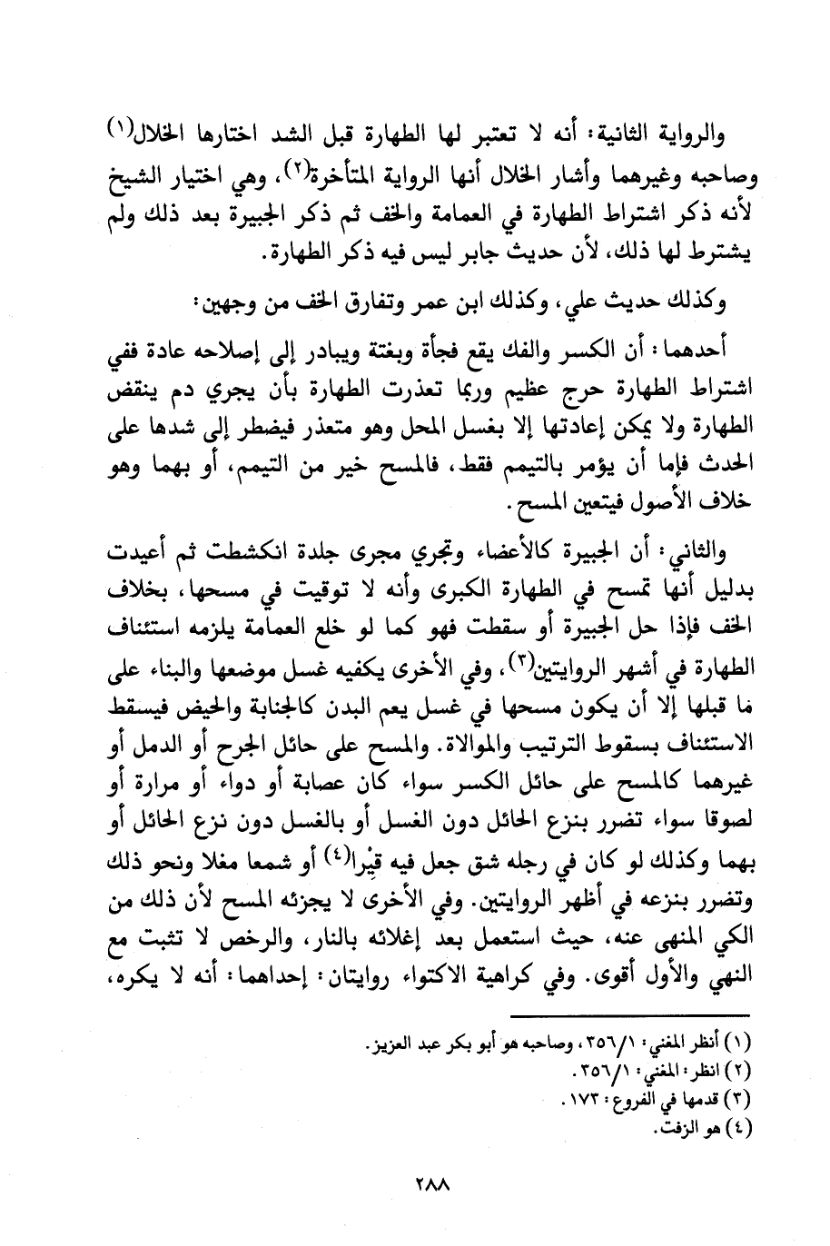 وَالثَّانِي: أَنَّ الْجَبِيرَةَ كَالْأَعْضَاءِ، وَتَجْرِي مَجْرَى جِلْدَةٍ انْكَشَطَتْ ثُمَّ أُعِيدَتْ بِدَلِيلِ أَنَّهَا تُمْسَحُ فِي الطَّهَارَةِ الْكُبْرَى وَأَنَّهُ لَا تَوْقِيتَ فِي مَسْحِهَا، بِخِلَافِ الْخُفِّ فَإِذَا حَلَّ الْجَبِيرَةَ أَوْ سَقَطَتْ فَهُوَ كَمَا لَوْ خَلَعَ الْعِمَامَةَ يَلْزَمُهُ اسْتِئْنَافُ الطَّهَارَةِ فِي أَشْهَرِ الرِّوَايَتَيْنِ، وَفِي الْأُخْرَى يَكْفِيهِ غَسْلُ مَوْضِعِهَا وَالْبِنَاءُ عَلَى مَا قَبْلَهَا إِلَّا أَنْ يَكُونَ مَسَحَهَا فِي غَسْلٍ يَعُمُّ الْبَدَنَ كَالْجَنَابَةِ وَالْحَيْضِ، فَيَسْقُطُ الِاسْتِئْنَافُ بِسُقُوطِ التَّرْتِيبِ وَالْمُوَالَاةِ، وَالْمَسْحُ عَلَى حَائِلِ الْجُرْحِ أَوِ الدُّمَّلِ أَوْ غَيْرِهِمَا كَالْمَسْحِ عَلَى حَائِلِ الْكَسْرِ سَوَاءٌ كَانَ عِصَابَةً أَوْ دَوَاءً أَوْ مَرَارَةً أَوْ لُصُوقًا سَوَاءٌ تَضَرَّرَ بِنَزْعِ الْحَائِلِ دُونَ الْغَسْلِ أَوْ بِالْغَسْلِ دُونَ نَزْعِ الْحَائِلِ أَوْ بِهِمَا، وَكَذَلِكَ لَوْ كَانَ فِي رِجْلِهِ شَقٌّ جَعَلَ فِيهِ قِيرًا أَوْ شَمْعًا مُغْلًا وَنَحْوَ ذَلِكَ، وَتَضَرَّرَ بِنَزْعِهِ فِي أَظْهَرِ الرِّوَايَتَيْنِ، وَفِي الْأُخْرَى لَا يُجْزِئُهُ الْمَسْحُ لِأَنَّ ذَلِكَ مِنَ الْكَيِّ الْمَنْهِيِّ عَنْهُ، حَيْثُ اسْتُعْمِلَ بَعْدَ إِغْلَائِهِ بِالنَّارِ، وَالرُّخَصُ لَا تَثْبُتُ مَعَ النَّهْيِ، وَالْأَوَّلُ أَقْوَى، وَفِي كَرَاهِيَةِ الِاكْتِوَاءِ رِوَايَتَانِ: إِحْدَاهُمَا: أَنَّهُ يُكْرَهُ،