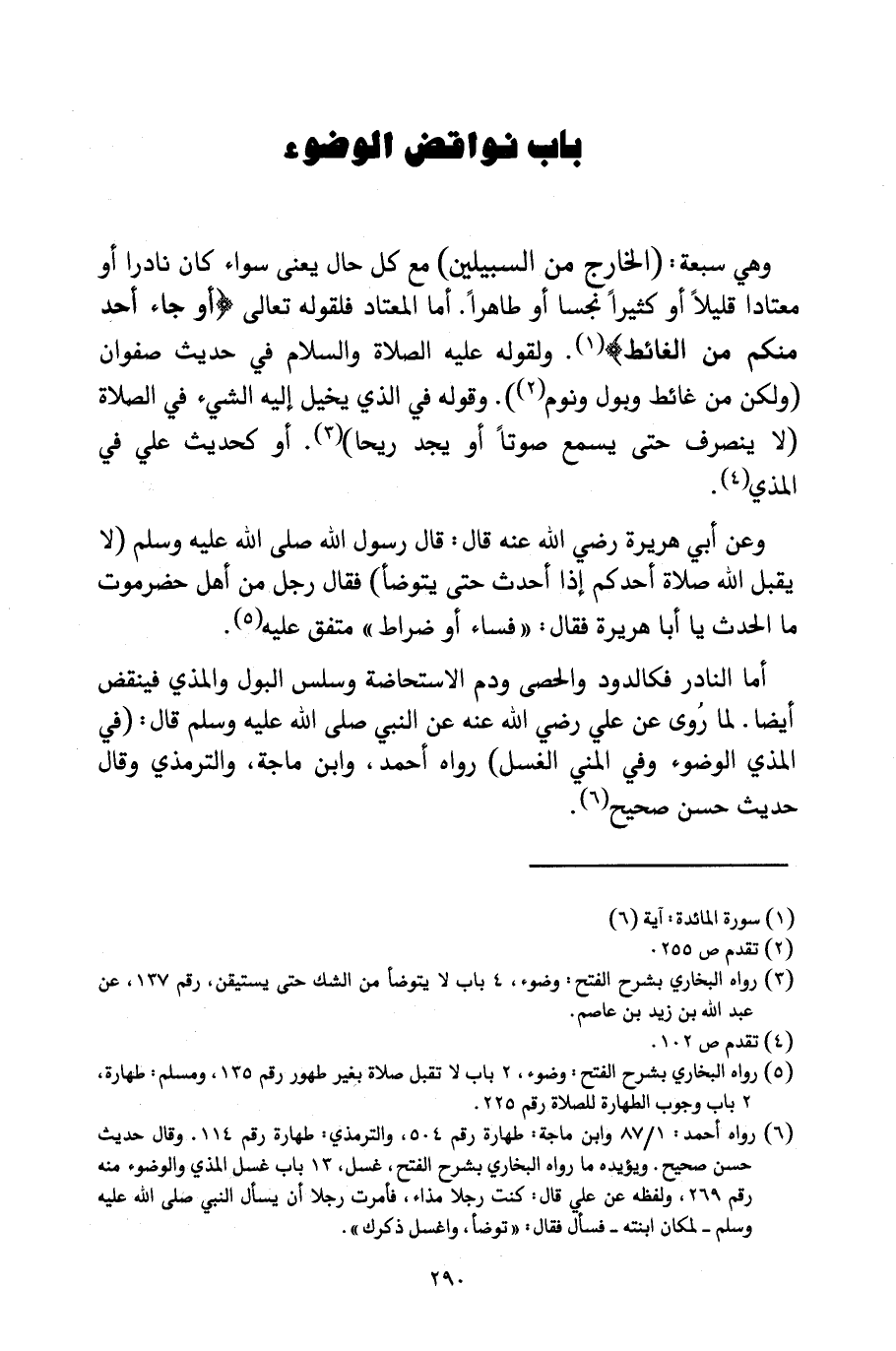 وَهِيَ سَبْعَةٌ: (الْخَارِجُ مِنَ السَّبِيلَيْنِ) مَعَ كُلِّ حَالٍ يَعْنِي: سَوَاءٌ كَانَ نَادِرًا أَوْ مُعْتَادًا قَلِيلًا أَوْ كَثِيرًا نَجِسًا أَوْ طَاهِرًا، أَمَّا الْمُعْتَادُ فَلِقَوْلِهِ تَعَالَى: {أَوْ جَاءَ أَحَدٌ مِنْكُمْ مِنَ الْغَائِطِ} [المائدة: 6] وَلِقَوْلِهِ عَلَيْهِ الصَّلَاةُ وَالسَّلَامُ فِي حَدِيثِ صَفْوَانَ: («وَلَكِنْ مِنْ غَائِطٍ وَبَوْلٍ وَنَوْمٍ») وَقَوْلِهِ فِي الَّذِي يُخَيَّلُ إِلَيْهِ الشَّيْءُ فِي الصَّلَاةِ («لَا يَنْصَرِفُ حَتَّى يَسْمَعَ صَوْتًا أَوْ يَجِدَ رِيحًا») أَوْ كَحَدِيثِ عَلِيٍّ فِي الْمَذْيِ.