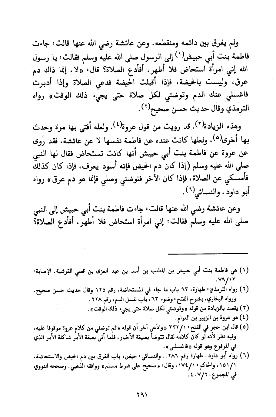 وَلَمْ يُفَرِّقْ بَيْنَ دَائِمِهِ وَمُنْقَطِعِهِ، وَعَنْ عَائِشَةَ رَضِيَ اللَّهُ عَنْهَا قَالَتْ: «جَاءَتْ فَاطِمَةُ بِنْتُ أَبِي حُبَيْشٍ إِلَى الرَّسُولِ صَلَّى اللَّهُ عَلَيْهِ وَسَلَّمَ فَقَالَتْ: يَا رَسُولَ اللَّهِ، إِنِّي امْرَأَةٌ أُسْتَحَاضُ فَلَا أَطْهُرُ، أَفَأَدَعُ الصَّلَاةَ قَالَ: (لَا، إِنَّمَا ذَاكَ دَمُ عِرْقٍ، وَلَيْسَتْ بِالْحَيْضَةِ، فَإِذَا أَقْبَلَتِ الْحَيْضَةُ فَدَعِي الصَّلَاةَ وَإِذَا أَدْبَرَتْ فَاغْسِلِي عَنْكِ الدَّمَ وَتَوَضَّئِي لِكُلِّ صَلَاةٍ حَتَّى يَجِيءَ ذَلِكَ الْوَقْتُ)» رَوَاهُ التِّرْمِذِيُّ وَقَالَ: حَدِيثٌ حَسَنٌ صَحِيحٌ.