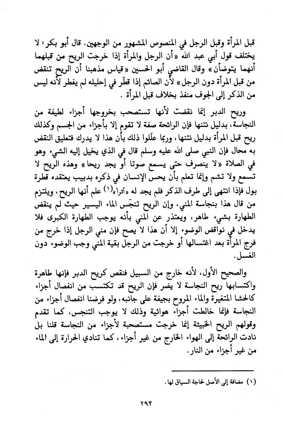 وَرِيحُ الدُّبُرِ إِنَّمَا نَقَضَتْ لِأَنَّهَا تَسْتَصْحِبُ بِخُرُوجِهَا أَجْزَاءَ لَطِيفَةً مِنَ النَّجَاسَةِ، بِدَلِيلِ نَتَنِهَا فَإِنَّ الرَّائِحَةَ صِفَةٌ لَا تَقُومُ إِلَّا بِأَجْزَاءٍ مِنَ الْجِسْمِ وَكَذَلِكَ رِيحُ قُبُلِ الْمَرْأَةِ بِدَلِيلِ نَتَنِهَا، وَرُبَّمَا عَلَّلُوا ذَلِكَ بِأَنَّ هَذَا لَا يُدْرَكُ فَتَعْلِيقُ النَّقْضِ بِهِ مُحَالٌ، فَإِنَّ النَّبِيَّ صَلَّى اللَّهُ عَلَيْهِ وَسَلَّمَ قَالَ فِي الَّذِي يُخَيَّلُ إِلَيْهِ الشَّيْءُ وَهُوَ فِي الصَّلَاةِ («لَا يَنْصَرِفْ حَتَّى يَسْمَعَ صَوْتًا أَوْ يَجِدَ رِيحًا») وَهَذِهِ الرِّيحُ لَا تُسْمَعُ وَلَا تُشَمُّ وَإِنَّمَا تُعْلَمُ بِأَنْ يَحُسَّ الْإِنْسَانُ فِي ذَكَرِهِ بِدَبِيبٍ يَعْتَقِدُهُ قَطْرَةَ بَوْلٍ فَإِذَا انْتَهَى إِلَى طَرَفِ الذَّكَرِ فَلَمْ يَجِدْ لَهُ (أَثَرًا) عَلِمَ أَنَّهَا الرِّيحُ، وَيَلْتَزِمُ مَنْ قَالَ هَذَا بِنَجَاسَةِ الْمَنِيِّ، وَإِنَّ الرِّيحَ تُنْجِسُ الْمَاءَ الْيَسِيرَ حَيْثُ لَمْ يَنْقُضِ الطَّهَارَةَ بِشَيْءٍ طَاهِرٍ وَيُعْتَذَرُ عَنِ الْمَنِيِّ بِأَنَّهُ يُوجِبُ الطَّهَارَةَ الْكُبْرَى، فَلَا يَدْخُلُ فِي نَوَاقِضِ الْوُضُوءِ، إِلَّا أَنَّ هَذَا لَا يَصِحُّ فَإِنَّ مَنِيَّ الرَّجُلِ إِذَا خَرَجَ مِنْ فَرْجِ الْمَرْأَةِ بَعْدَ اغْتِسَالِهَا أَوْ خَرَجَتْ مِنَ الرَّجُلِ بَقِيَّةُ الْمَنِيِّ وَجَبَ الْوُضُوءُ دُونَ الْغُسْلِ.