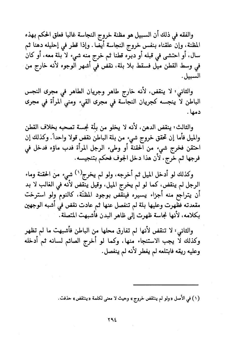 وَالْفِقْهُ فِي ذَلِكَ أَنَّ السَّبِيلَ هُوَ مَظِنَّةُ خُرُوجِ النَّجَاسَةِ غَالِبًا فَعُلِّقَ الْحُكْمُ بِهَذِهِ الْمَظِنَّةِ، وَإِنْ عَلَّقْنَاهُ بِنَفْسِ خُرُوجِ النَّجَاسَةِ أَيْضًا، وَإِذَا قُطِّرَ فِي إِحْلِيلِهِ دُهْنًا ثُمَّ سَالَ، أَوِ احْتَشَى فِي قُبُلِهِ أَوْ دُبُرِهِ قُطْنًا ثُمَّ خَرَجَ مِنْهُ شَيْءٌ لَا بِلَّةَ مَعَهُ، أَوْ كَانَ فِي وَسَطِ الْقُطْنِ مِيلٌ فَسَقَطَ بِلَا بِلَّةٍ، نَقَضَ فِي أَشْهَرِ الْوُجُوهِ لِأَنَّهُ خَارِجٌ مِنَ السَّبِيلِ.