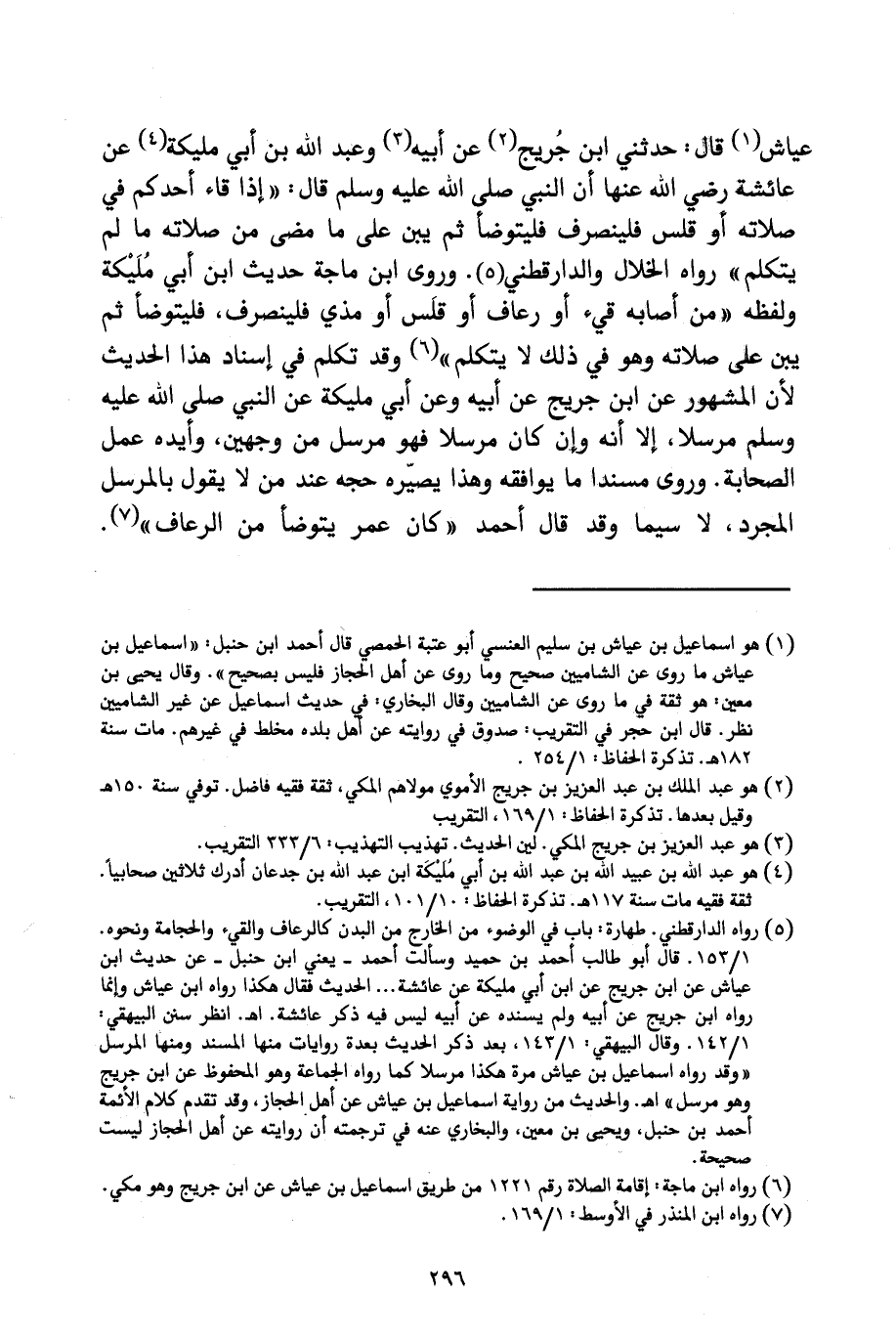 عَيَّاشٍ قَالَ: حَدَّثَنِي ابْنُ جُرَيْجٍ عَنْ أَبِيهِ وَعَبْدِ اللَّهِ بْنِ أَبِي مُلَيْكَةَ عَنْ عَائِشَةَ رَضِيَ اللَّهُ عَنْهَا: أَنَّ النَّبِيَّ صَلَّى اللَّهُ عَلَيْهِ وَسَلَّمَ قَالَ: («إِذَا قَاءَ أَحَدُكُمْ فِي صَلَاتِهِ أَوْ قَلَسَ فَلْيَنْصَرِفْ فَلْيَتَوَضَّأْ ثُمَّ يَبْنِ عَلَى مَا مَضَى مِنْ صَلَاتِهِ مَا لَمْ يَتَكَلَّمْ») رَوَاهُ الْخَلَّالُ وَالدَّارَقُطْنِيُّ، وَرَوَى ابْنُ مَاجَهْ حَدِيثَ ابْنِ أَبِي مُلَيْكَةَ وَلَفْظُهُ: " «مَنْ أَصَابَهُ قَيْءٌ أَوْ رُعَافٌ أَوْ قَلْسٌ أَوْ مَذْيٌ فَلْيَنْصَرِفْ فَلْيَتَوَضَّأْ ثُمَّ يَبْنِ عَلَى صَلَاتِهِ وَهُوَ فِي ذَلِكَ لَا يَتَكَلَّمُ» "، وَقَدْ تُكُلِّمَ فِي إِسْنَادِ هَذَا الْحَدِيثِ لِأَنَّ الْمَشْهُورَ عَنِ ابْنِ جُرَيْجٍ عَنْ أَبِيهِ وَعَنْ أَبِي مُلَيْكَةَ عَنِ النَّبِيِّ صَلَّى اللَّهُ عَلَيْهِ وَسَلَّمَ مُرْسَلًا، إِلَّا أَنَّهُ وَإِنْ كَانَ مُرْسَلًا فَهُوَ مُرْسَلٌ مِنْ وَجْهَيْنِ، وَأَيَّدَهُ عَمَلُ الصَّحَابَةِ، وَرُوِيَ مُسْنَدًا مَا يُوَافِقُهُ وَهَذَا يُصَيِّرُهُ حُجَّةً عِنْدَ مَنْ لَا يَقُولُ بِالْمُرْسَلِ الْمُجَرَّدِ، لَا سِيَّمَا وَقَدْ قَالَ أَحْمَدُ: " كَانَ عُمَرُ يَتَوَضَّأُ مِنَ الرُّعَافِ ".