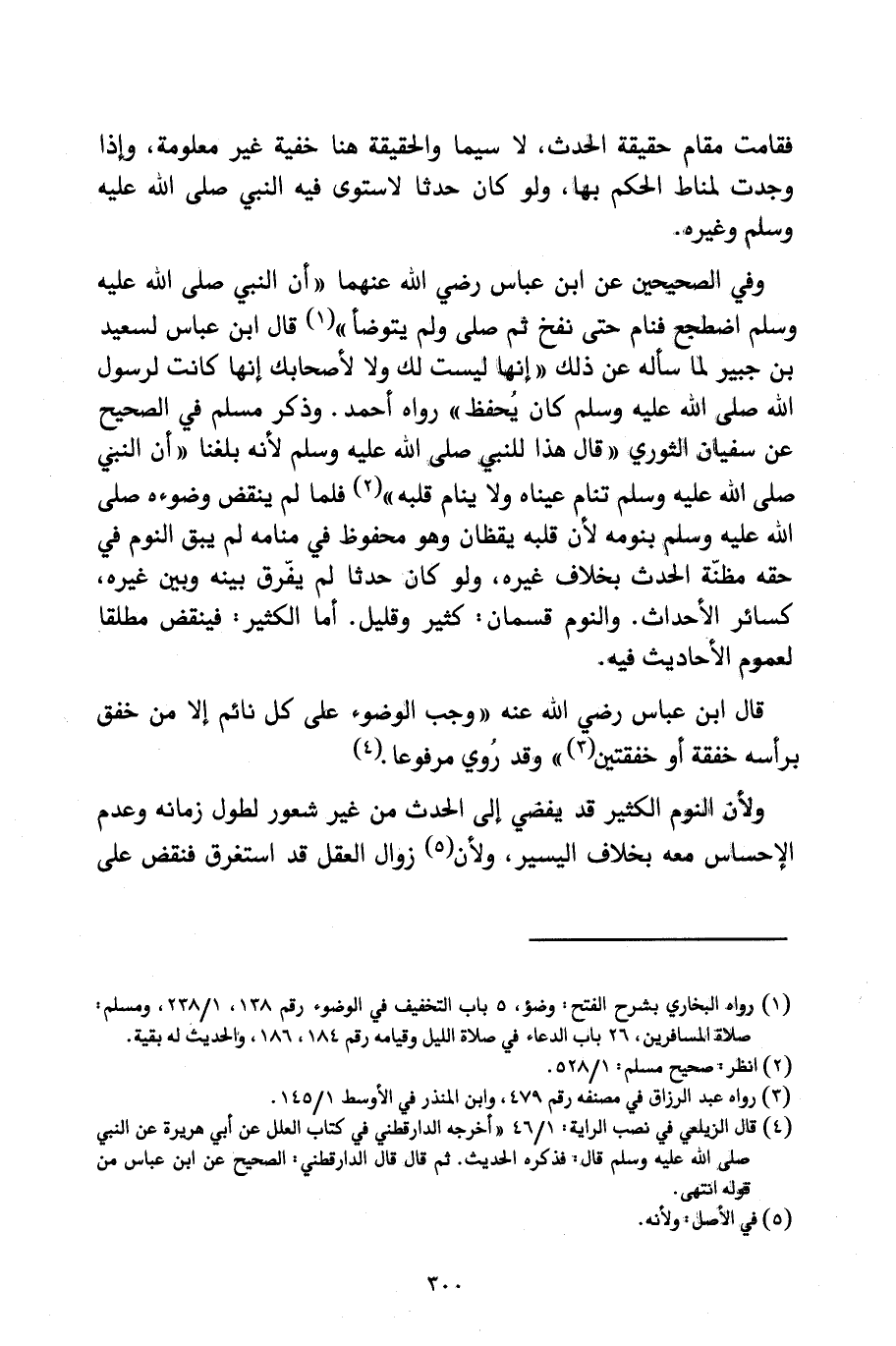وَفِي الصَّحِيحَيْنِ عَنِ ابْنِ عَبَّاسٍ رَضِيَ اللَّهُ عَنْهُمَا " «أَنَّ النَّبِيَّ صَلَّى اللَّهُ عَلَيْهِ وَسَلَّمَ اضْطَجَعَ حَتَّى نَفَخَ ثُمَّ صَلَّى وَلَمْ يَتَوَضَّأْ» " قَالَ ابْنُ عَبَّاسٍ لِسَعِيدِ بْنِ جُبَيْرٍ لَمَّا سَأَلَهُ عَنْ ذَلِكَ: " إِنَّهَا لَيْسَتْ لَكَ وَلَا لِأَصْحَابِكَ إِنَّهَا كَانَتْ لِرَسُولِ اللَّهِ صَلَّى اللَّهُ عَلَيْهِ وَسَلَّمَ كَانَ يُحْفَظُ " رَوَاهُ أَحْمَدُ، وَذَكَرَ مُسْلِمٌ فِي الصَّحِيحِ عَنْ سُفْيَانَ الثَّوْرِيِّ قَالَ هَذَا لِلنَّبِيِّ صَلَّى اللَّهُ عَلَيْهِ وَسَلَّمَ لِأَنَّهُ بَلَغَنَا " «أَنَّ النَّبِيَّ صَلَّى اللَّهُ عَلَيْهِ وَسَلَّمَ تَنَامُ عَيْنَاهُ وَلَا يَنَامُ قَلْبُهُ» " فَلَمَّا لَمْ يُنْقَضُ وُضُوءُهُ صَلَّى اللَّهُ عَلَيْهِ وَسَلَّمَ بِنَوْمِهِ لِأَنَّ قَلْبَهُ يَقْظَانُ وَهُوَ مَحْفُوظٌ فِي مَنَامِهِ لَمْ يَبْقَ النَّوْمُ فِي حَقِّهِ مَظِنَّةَ الْحَدَثِ بِخِلَافِ غَيْرِهِ، وَلَوْ كَانَ حَدَثًا لَمْ يُفَرَّقْ بَيْنَهُ وَبَيْنَ غَيْرِهِ كَسَائِرِ الْأَحْدَاثِ، وَالنَّوْمُ قِسْمَانِ: كَثِيرٌ وَقَلِيلٌ، أَمَّا الْكَثِيرُ: فَيَنْقُضُ مُطْلَقًا لِعُمُومِ الْأَحَادِيثِ فِيهِ.