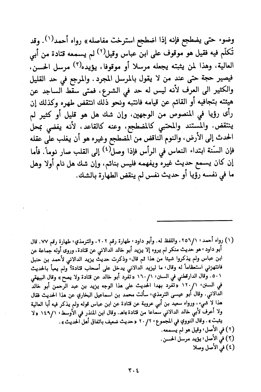 وُضُوءٌ حَتَّى يَضْطَجِعَ فَإِنَّهُ إِذَا اضْطَجَعَ اسْتَرْخَتْ مَفَاصِلُهُ») رَوَاهُ أَحْمَدُ وَقَدْ تُكُلِّمَ فِيهِ فَقِيلَ هُوَ مَوْقُوفٌ عَلَى ابْنِ عَبَّاسٍ وَقِيلَ لَمْ يَسْمَعْهُ قَتَادَةُ مِنْ أَبِي الْعَالِيَةِ، وَهَذَا لِمَنْ يُثْبِتُهُ يَجْعَلُهُ مُرْسَلًا أَوْ مَوْقُوفًا، يُؤَيِّدُهُ مُرْسَلُ الْحَسَنِ فَيَصِيرُ حُجَّةً حَتَّى عِنْدَ مَنْ لَا يَقُولُ بِالْمُرْسَلِ الْمُجَرَّدِ، وَالْمَرْجِعُ فِي حَدِّ الْقَلِيلِ وَالْكَثِيرِ إِلَى الْعُرْفِ لِأَنَّهُ لَيْسَ لَهُ حَدٌّ فِي الشَّرْعِ، فَمَتَى سَقَطَ السَّاجِدُ عَنْ هَيْئَتِهِ بِتَجَافِيهِ أَوِ الْقَائِمُ عَنْ قِيَامِهِ فَانْتَبَهَ وَنَحْوَ ذَلِكَ انْتَقَضَ طُهْرُهُ، وَكَذَلِكَ إِنْ رَأَى رُؤْيَا فِي الْمَنْصُوصِ مِنَ الْوَجْهَيْنِ، وَإِنْ شَكَّ هَلْ هُوَ قَلِيلٌ أَوْ كَثِيرٌ لَمْ يَنْتَقِضْ، وَالْمُسْتَنِدُ وَالْمُحْتَبِي كَالْمُضْطَجِعِ، وَعَنْهُ كَالْقَاعِدِ؛ لِأَنَّهُ يُفْضِي بِمَحَلِّ الْحَدَثِ إِلَى الْأَرْضِ وَالنَّوْمُ النَّاقِضُ مِنَ الْمُضْطَجِعِ وَغَيْرِهِ هُوَ أَنْ يَغْلِبَ عَلَى عَقْلِهِ فَإِنَّ السَّنَةَ ابْتِدَاءُ النُّعَاسِ فِي الرَّأْسِ فَإِذَا وَصَلَ إِلَى الْقَلْبِ صَارَ نَوْمًا، فَأَمَّا إِنْ كَانَ يَسْمَعُ حَدِيثَ غَيْرِهِ وَيَفْهَمُهُ فَلَيْسَ بِنَائِمٍ، وَإِنْ شَكَّ هَلْ نَامَ أَوْ لَا وَهَلْ مَا فِي نَفْسِهِ رُؤْيَا أَوْ حَدِيثُ نَفْسٍ لَمْ يَنْقُضِ الطَّهَارَةَ بِالشَّكِّ.