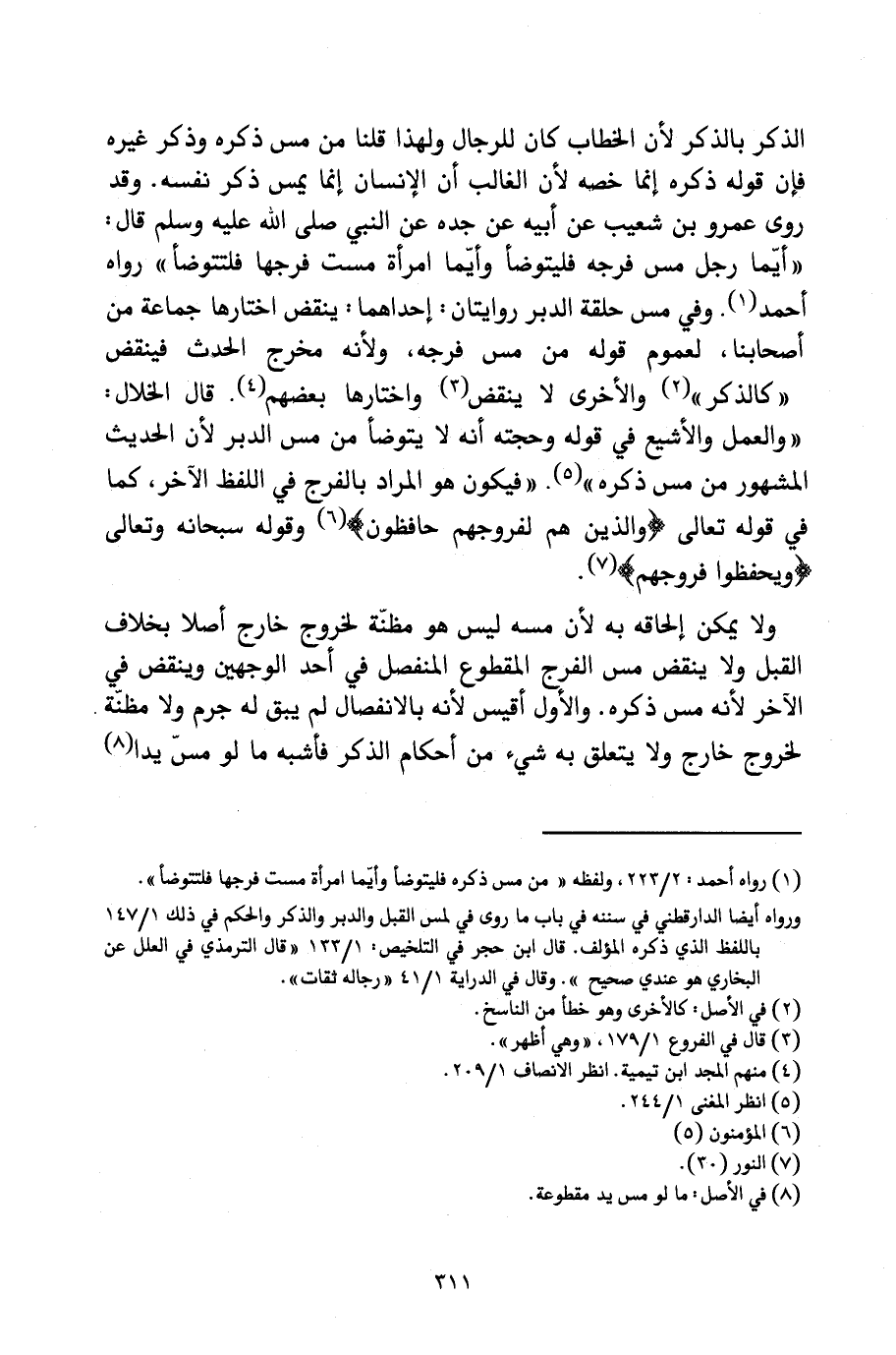 الذَّكَرِ بِالذَّكَرِ لِأَنَّ الْخِطَابَ كَانَ لِلرِّجَالِ وَلِهَذَا قُلْنَا مَنْ مَسَّ ذَكَرَهُ وَذَكَرَ غَيْرِهِ فَإِنَّ قَوْلَهُ: " ذَكَرَهُ " إِنَّمَا خَصَّهُ؛ لِأَنَّ الْغَالِبَ أَنَّ الْإِنْسَانَ إِنَّمَا يَمَسُّ ذَكَرَ نَفْسِهِ، وَقَدْ رَوَى عَمْرُو بْنُ شُعَيْبٍ عَنْ أَبِيهِ عَنْ جَدِّهِ عَنِ النَّبِيِّ صَلَّى اللَّهُ عَلَيْهِ وَسَلَّمَ قَالَ: " «أَيُّمَا رَجُلٍ مَسَّ فَرْجَهُ فَلْيَتَوَضَّأْ وَأَيُّمَا امْرَأَةٍ مَسَّتْ فَرْجَهَا فَلْتَتَوَضَّأْ» " رَوَاهُ أَحْمَدُ، وَفِي مَسِّ حَلَقَةِ الدُّبُرِ رِوَايَتَانِ: إِحْدَاهُمَا: يَنْقُضُ، اخْتَارَهَا جَمَاعَةٌ مِنْ أَصْحَابِنَا؛ لِعُمُومِ قَوْلِهِ " «مَنْ مَسَّ فَرْجَهُ» "، وَلِأَنَّهُ مَخْرَجُ الْحَدَثِ فَيَنْقُضُ " كَالذَّكَرِ " وَالْأُخْرَى لَا يَنْقُضُ وَاخْتَارَهَا بَعْضُهُمْ، قَالَ الْخَلَّالُ: " وَالْعَمَلُ وَالْأَشْيَعُ فِي قَوْلِهِ، وَحُجَّتُهُ أَنَّهُ لَا يَتَوَضَّأُ مَنْ مَسَّ الدُّبُرَ لِأَنَّ الْحَدِيثَ الْمَشْهُورَ مَنْ مَسَّ ذَكَرَهُ " " فَيَكُونُ هُوَ الْمُرَادَ بِالْفَرَجِ فِي اللَّفْظِ الْآخَرِ، كَمَا فِي قَوْلِهِ تَعَالَى {وَالَّذِينَ هُمْ لِفُرُوجِهِمْ حَافِظُونَ} [المؤمنون: 5] وَقَوْلِهِ سُبْحَانَهُ وَتَعَالَى {وَيَحْفَظُوا فُرُوجَهُمْ} [النور: 30].