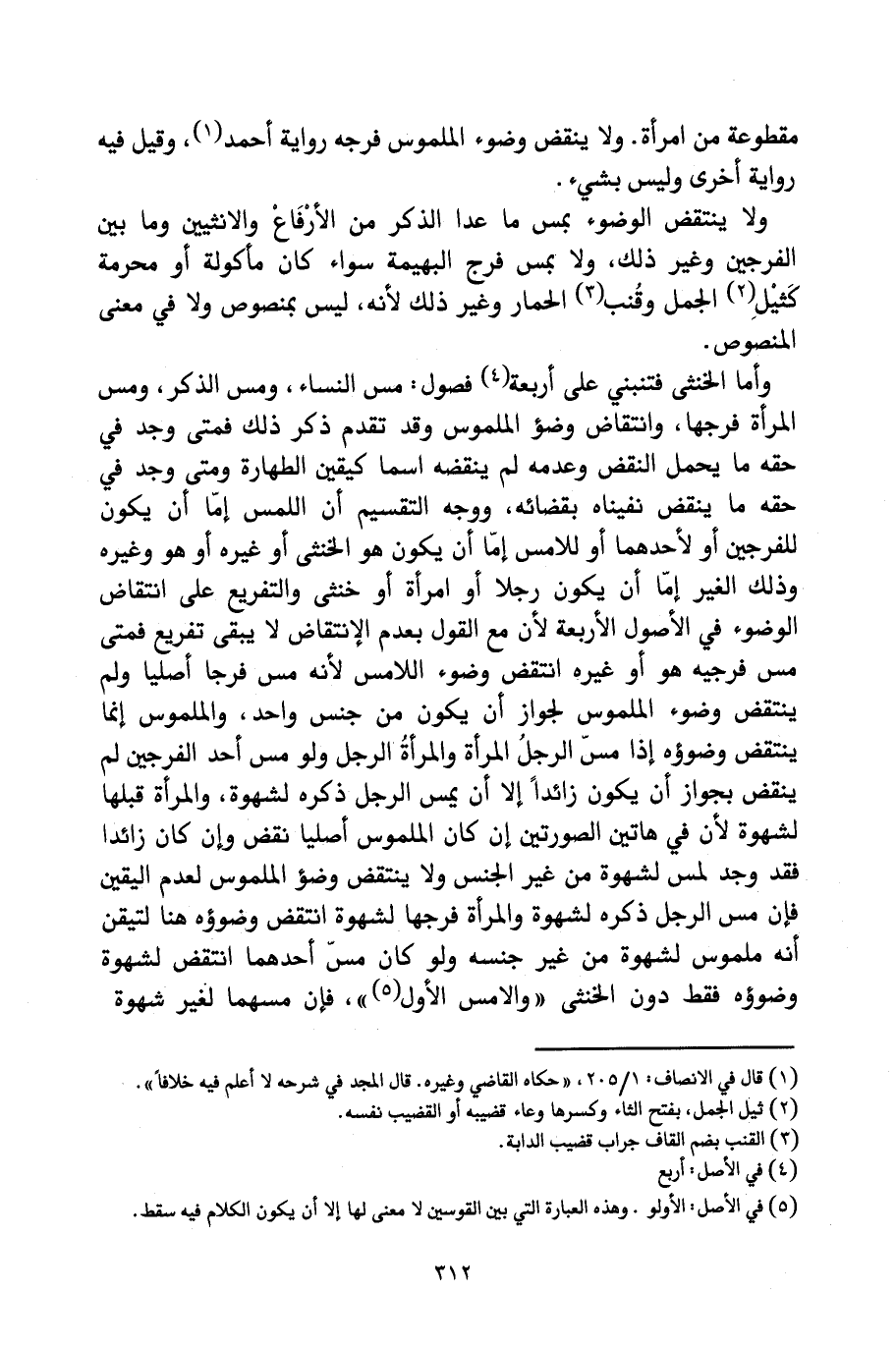 وَأَمَّا الْخُنْثَى فَتَنْبَنِي عَلَى أَرْبَعَةِ فُصُولٍ: مَسِّ النِّسَاءِ، وَمَسِّ الذَّكَرِ، وَمَسِّ الْمَرْأَةِ فَرْجَهَا، وَانْتِقَاضِ وُضُوءِ الْمَلْمُوسِ وَقَدْ تَقَدَّمَ ذِكْرُ ذَلِكَ فَمَتَى وُجِدَ فِي حَقِّهِ مَا يَحْمِلُ النَّقْضَ وَعَدَمَهُ لَمْ يَنْقُضْهُ اسْمًا كَيَقِينِ الطَّهَارَةِ وَمَتَى وُجِدَ فِي حَقِّهِ مَا يَنْقُضُ نَفَيْنَاهُ بِقَضَائِهِ، وَوَجْهُ التَّقْسِيمِ أَنَّ اللَّمْسَ إِمَّا أَنْ يَكُونَ لِلْفَرْجَيْنِ أَوْ لِأَحَدِهِمَا أَوْ لِلَامِسٍ إِمَّا أَنْ يَكُونَ هُوَ الْخُنْثَى أَوْ غَيْرَهُ أَوْ هُوَ وَغَيْرَهُ وَذَلِكَ الْغَيْرُ إِمَّا أَنْ يَكُونَ رَجُلًا أَوِ امْرَأَةً أَوْ خُنْثَى وَالتَّفْرِيعُ عَلَى انْتِقَاضِ الْوُضُوءِ فِي الْأُصُولِ الْأَرْبَعَةِ لِأَنَّ مَعَ الْقَوْلِ بِعَدَمِ الِانْتِقَاضِ لَا يَبْقَى تَفْرِيعٌ فَمَتَى مَسَّ فَرْجَيْهِ هُوَ أَوْ غَيْرُهُ انْتَقَضَ وُضُوءُ اللَّامِسِ لِأَنَّهُ مَسَّ فَرْجًا أَصْلِيًّا وَلَمْ يَنْتَقِضْ وُضُوءُ الْمَلْمُوسِ لِجَوَازِ أَنْ يَكُونَ مِنْ جِنْسٍ وَاحِدٍ، وَالْمَلْمُوسُ إِنَّمَا يَنْتَقِضُ وُضُوءُهُ إِذَا مَسَّ الرَّجُلُ الْمَرْأَةَ وَالْمَرْأَةُ الرَّجُلَ وَلَوْ مَسَّ أَحَدَ الْفَرْجَيْنِ لَمْ يُنْقَضْ بِجَوَازِ أَنْ يَكُونَ زَائِدًا إِلَّا أَنْ يَمَسَّ الرَّجُلُ ذَكَرَهُ لِشَهْوَةٍ، وَالْمَرْأَةُ قُبُلَهَا لِشَهْوَةٍ لِأَنَّ فِي هَاتَيْنِ الصُّورَتَيْنِ إِنْ كَانَ الْمَلْمُوسُ أَصْلِيًّا نَقَضَ وَإِنْ كَانَ زَائِدًا فَقَدْ وُجِدَ لَمْسٌ لِشَهْوَةٍ مِنْ غَيْرِ الْجِنْسِ وَلَا يَنْتَقِضُ وُضُوءُ الْمَلْمُوسِ لِعَدَمِ الْيَقِينِ فَإِنْ مَسَّ الرَّجُلُ ذَكَرَهُ لِشَهْوَةٍ وَالْمَرْأَةُ فَرْجَهَا لِشَهْوَةٍ انْتَقَضَ وُضُوءُهُ هُنَا لِتَيَقُّنِ أَنَّهُ مَلْمُوسٌ لِشَهْوَةٍ مِنْ غَيْرِ جِنْسِهِ وَلَوْ كَانَ مَسَّ أَحَدَهُمَا انْتَقَضَ لِشَهْوَةٍ وُضُوءُهُ فَقَطْ دُونَ الْخُنْثَى " وَاللَّامِسُ الْأَوَّلُ " فَإِنْ مَسَّهُمَا لِغَيْرِ شَهْوَةٍ
