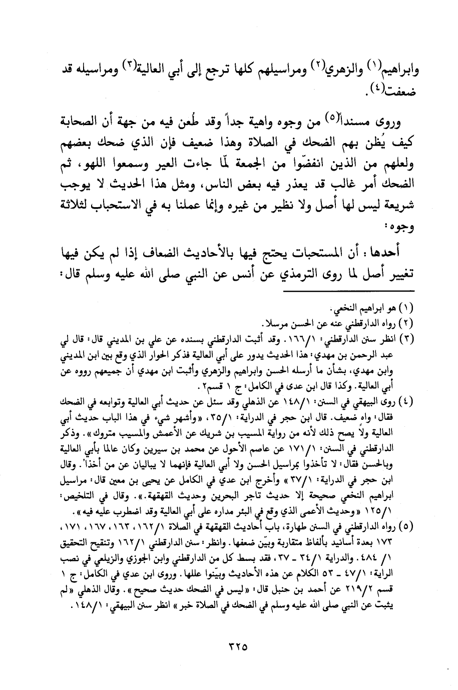 وَرُوِيَ مُسْنَدًا مِنْ وُجُوهٍ وَاهِيَةٍ جِدًّا، وَقَدْ طُعِنَ فِيهِ مِنْ جِهَةِ أَنَّ الصَّحَابَةَ كَيْفَ يُظَنُّ بِهِمُ الضَّحِكُ فِي الصَّلَاةِ، وَهَذَا ضَعِيفٌ، فَإِنَّ الَّذِي ضَحِكَ بَعْضُهُمْ، وَلَعَلَّهُمْ مِنَ الَّذِينَ انْفَضُّوا مِنَ الْجُمُعَةِ لَمَّا جَاءَتِ الْعِيرُ وَسَمِعُوا اللَّهْوَ، ثُمَّ الضَّحِكُ أَمْرٌ غَالِبٌ قَدْ يُعْذَرُ فِيهِ بَعْضُ النَّاسِ، وَمِثْلُ هَذَا الْحَدِيثِ لَا يُوجِبُ شَرِيعَةً لَيْسَ لَهَا أَصْلٌ وَلَا نَظِيرٌ مِنْ غَيْرِهِ، وَإِنَّمَا عَمِلْنَا بِهِ فِي الِاسْتِحْبَابِ لِثَلَاثَةِ وُجُوهٍ: