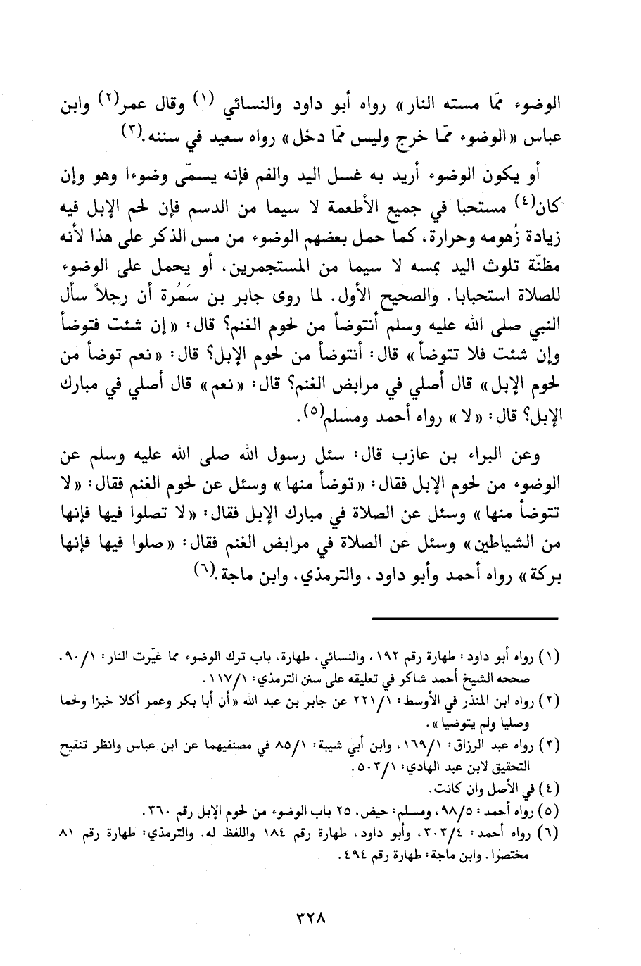 أَوْ يَكُونُ الْوُضُوءُ أُرِيدَ بِهِ غَسْلُ الْيَدِ وَالْفَمِ، فَإِنَّهُ يُسَمَّى وُضُوءًا، وَهُوَ وَإِنْ كَانَ مُسْتَحَبًّا فِي جَمِيعِ الْأَطْعِمَةِ لَا سِيَّمَا مِنَ الدَّسَمِ، فَإِنَّ لَحْمَ الْإِبِلِ فِيهِ زِيَادَةُ زُهُومَةٍ وَحَرَارَةٍ. كَمَا حَمَلَ بَعْضُهُمُ الْوُضُوءَ مِنْ مَسِّ الذَّكَرِ عَلَى هَذَا؛ لِأَنَّهُ مَظِنَّةُ تَلَوُّثِ الْيَدِ بِمَسِّهِ لَا سِيَّمَا مِنَ الْمُسْتَجْمِرِينَ، أَوْ يُحْمَلُ عَلَى الْوُضُوءِ لِلصَّلَاةِ اسْتِحْبَابًا. وَالصَّحِيحُ الْأَوَّلُ؛ لِمَا رَوَى جَابِرُ بْنُ سَمُرَةَ أَنَّ رَجُلًا سَأَلَ النَّبِيَّ - صَلَّى اللَّهُ عَلَيْهِ وَسَلَّمَ -: " «أَنَتَوَضَّأُ مِنْ لُحُومِ الْغَنَمِ؟ " قَالَ: " إِنْ شِئْتَ فَتَوَضَّأْ، وَإِنْ شِئْتَ فَلَا تَتَوَضَّأْ " قَالَ: " أَنَتَوَضَّأُ مِنْ لُحُومِ الْإِبِلِ؟ " قَالَ: " نَعَمْ تَوَضَّأْ مِنْ لُحُومِ الْإِبِلِ " قَالَ: " أُصَلِّي فِي مَرَابِضِ الْغَنَمِ؟ " قَالَ: " نَعَمْ " قَالَ: " أُصَلِّي فِي مَبَارِكِ الْإِبِلِ؟ " قَالَ: " لَا» رَوَاهُ أَحْمَدُ وَمُسْلِمٌ.