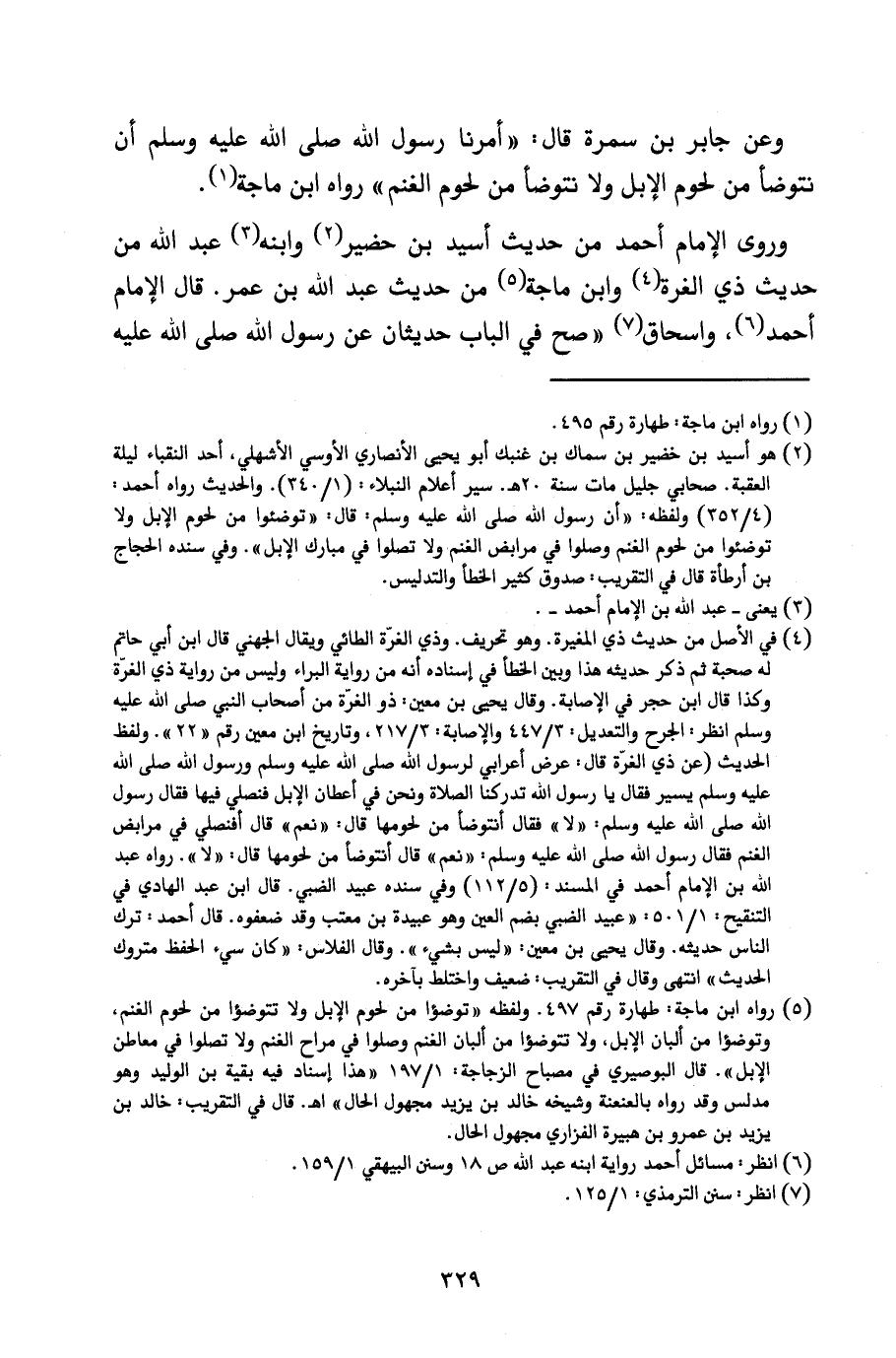 وَعَنْ جَابِرِ بْنِ سَمُرَةَ قَالَ: " «أَمَرَنَا رَسُولُ اللَّهِ - صَلَّى اللَّهُ عَلَيْهِ وَسَلَّمَ - أَنْ نَتَوَضَّأَ مِنْ لُحُومِ الْإِبِلِ وَلَا نَتَوَضَّأَ مِنْ لُحُومِ الْغَنَمِ» ". رَوَاهُ ابْنُ مَاجَهْ.