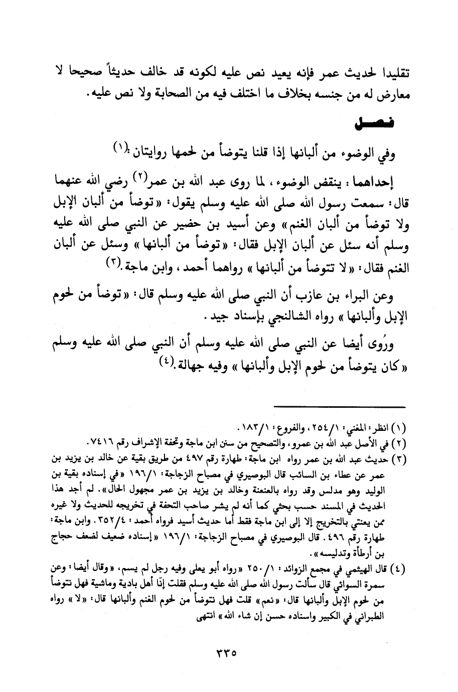 إِحْدَاهُمَا: يَنْقُضُ الْوُضُوءَ، لِمَا رَوَى عَبْدُ اللَّهِ بْنُ عُمَرَ - رَضِيَ اللَّهُ عَنْهُمَا - قَالَ: سَمِعْتُ رَسُولَ اللَّهِ - صَلَّى اللَّهُ عَلَيْهِ وَسَلَّمَ - يَقُولُ: " «تَوَضَّأْ مِنْ أَلْبَانِ الْإِبِلِ، وَلَا تَوَضَّأْ مِنْ أَلْبَانِ الْغَنَمِ» " وَعَنْ أُسَيْدِ بْنِ حُضَيْرٍ، عَنِ النَّبِيِّ - صَلَّى اللَّهُ عَلَيْهِ وَسَلَّمَ - «أَنَّهُ سُئِلَ عَنْ أَلْبَانِ الْإِبِلِ فَقَالَ: " تَوَضَّأْ مِنْ أَلْبَانِهَا " وَسُئِلَ عَنْ أَلْبَانِ الْغَنَمِ فَقَالَ: " لَا تَتَوَضَّأْ مِنْ أَلْبَانِهَا» " رَوَاهُمَا أَحْمَدُ، وَابْنُ مَاجَهْ.