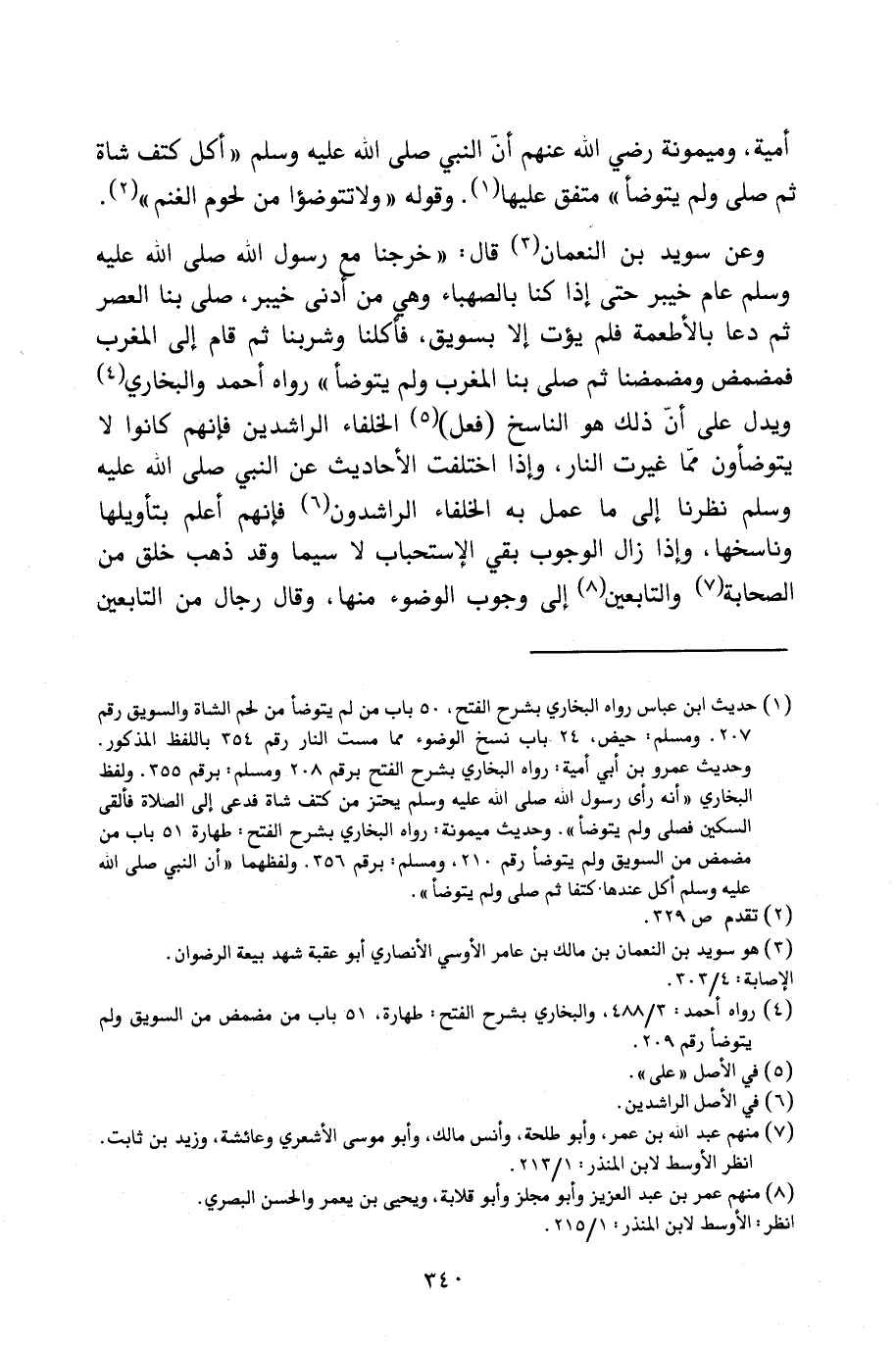 وَعَنْ سُوَيْدِ بْنِ النُّعْمَانِ قَالَ: " «خَرَجْنَا مَعَ رَسُولِ اللَّهِ - صَلَّى اللَّهُ عَلَيْهِ وَسَلَّمَ - عَامَ خَيْبَرَ حَتَّى إِذَا كُنَّا بِالصَّهْبَاءِ - وَهِيَ مِنْ أَدْنَى خَيْبَرَ - صَلَّى بِنَا الْعَصْرَ، ثُمَّ دَعَا بِالْأَطْعِمَةِ، فَلَمْ يُؤْتَ إِلَّا بِسَوِيقٍ، فَأَكَلْنَا وَشَرِبْنَا، ثُمَّ قَامَ إِلَى الْمَغْرِبِ، فَمَضْمَضَ وَمَضْمَضْنَا، ثُمَّ صَلَّى بِنَا الْمَغْرِبَ وَلَمْ يَتَوَضَّأْ» " رَوَاهُ أَحْمَدُ وَالْبُخَارِيُّ. وَيَدُلُّ عَلَى أَنَّ ذَلِكَ هُوَ النَّاسِخُ (فِعْلُ) الْخُلَفَاءِ الرَّاشِدِينَ، فَإِنَّهُمْ كَانُوا لَا يَتَوَضَّئُونَ مِمَّا غَيَّرَتِ النَّارُ، وَإِذَا اخْتَلَفَتِ الْأَحَادِيثُ عَنِ النَّبِيِّ - صَلَّى اللَّهُ عَلَيْهِ وَسَلَّمَ - نَظَرْنَا إِلَى مَا عَمِلَ بِهِ الْخُلَفَاءُ الرَّاشِدُونَ، فَإِنَّهُمْ أَعْلَمُ بِتَأْوِيلِهَا وَنَاسِخِهَا، وَإِذَا زَالَ الْوُجُوبُ بَقِيَ الِاسْتِحْبَابُ، لَا سِيَّمَا وَقَدْ ذَهَبَ خَلْقٌ مِنَ الصَّحَابَةِ وَالتَّابِعِينَ إِلَى وُجُوبِ الْوُضُوءِ مِنْهَا، وَقَالَ رِجَالٌ مِنَ التَّابِعِينَ: