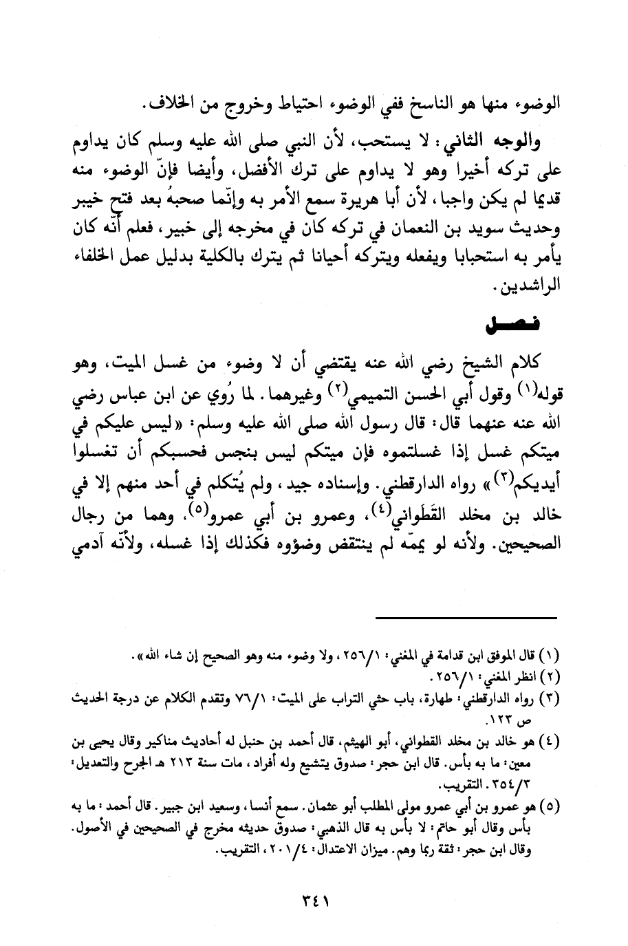 كَلَامُ الشَّيْخِ - رَضِيَ اللَّهُ عَنْهُ - يَقْتَضِي أَنْ لَا وُضُوءَ مِنْ غُسْلِ الْمَيِّتِ، وَهُوَ قَوْلُهُ وَقَوْلُ أَبِي الْحَسَنِ التَّمِيمِيِّ وَغَيْرِهِمَا؛ لِمَا رُوِيَ عَنِ ابْنِ عَبَّاسٍ - رَضِيَ اللَّهُ عَنْهُمَا - قَالَ: قَالَ رَسُولُ اللَّهِ - صَلَّى اللَّهُ عَلَيْهِ وَسَلَّمَ -: " «لَيْسَ فِي مَيِّتِكُمْ غُسْلٌ إِذَا غَسَّلْتُمُوهُ، فَإِنَّ مَيِّتَكُمْ لَيْسَ بِنَجِسٍ، فَحَسْبُكُمْ أَنْ تَغْسِلُوا أَيْدِيَكُمْ» " رَوَاهُ الدَّارَقُطْنِيِّ وَإِسْنَادُهُ جَيِّدٌ، وَلَمْ يَتَكَلَّمْ فِي أَحَدٍ مِنْهُمْ إِلَّا فِي خَالِدِ بْنِ مَخْلَدٍ الْقَطَوَانِيِّ وَعَمْرِو بْنِ أَبِي عَمْرٍو، وَهُمَا مِنْ رِجَالِ الصَّحِيحَيْنِ؛ وَلِأَنَّهُ لَوْ يَمَّمَهُ لَمْ يَنْتَقِضْ وُضُوؤُهُ، فَكَذَلِكَ إِذَا غَسَّلَهُ، وَلِأَنَّهُ آدَمِيٌّ