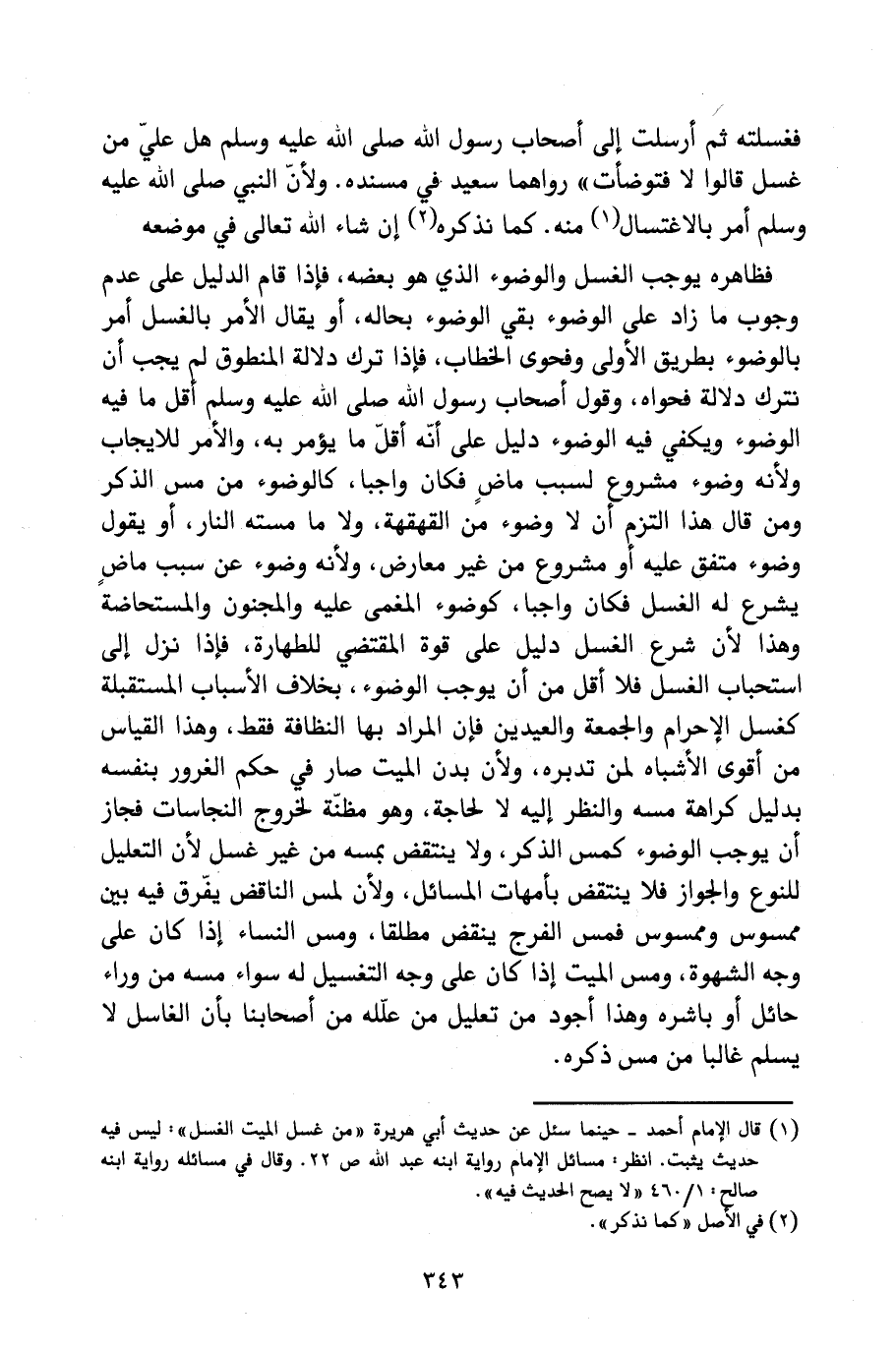 فَظَاهِرُهُ يُوجِبُ الْغُسْلَ وَالْوُضُوءَ الَّذِي هُوَ بَعْضُهُ، فَإِذَا قَامَ الدَّلِيلُ عَلَى عَدَمِ وُجُوبِ مَا زَادَ عَلَى الْوُضُوءِ بَقِيَ الْوُضُوءُ بِحَالِهِ، أَوْ يُقَالُ: الْأَمْرُ بِالْغُسْلِ أَمْرٌ بِالْوُضُوءِ بِطَرِيقِ الْأَوْلَى، وَفَحْوَى الْخِطَابِ، فَإِذَا تُرِكَ دَلَالَةُ الْمَنْطُوقِ لَمْ يَجِبْ أَنْ نَتْرُكَ دَلَالَةَ فَحَوَاهُ، وَقَوْلُ أَصْحَابِ رَسُولِ اللَّهِ - صَلَّى اللَّهُ عَلَيْهِ وَسَلَّمَ - أَقَلُّ مَا فِيهِ الْوُضُوءُ، وَيَكْفِي فِيهِ الْوُضُوءُ دَلِيلٌ عَلَى أَنَّهُ أَقَلُّ مَا يُؤْمَرُ بِهِ، وَالْأَمْرُ لِلْإِيجَابِ؛ وَلِأَنَّهُ وُضُوءٌ مَشْرُوعٌ لِسَبَبٍ مَاضٍ، فَكَانَ وَاجِبًا كَالْوُضُوءِ مِنْ مَسِّ الذَّكَرِ، وَمَنْ قَالَ هَذَا الْتَزَمَ أَنْ لَا وُضُوءَ مِنَ الْقَهْقَهَةِ، وَلَا مَا مَسَّتْهُ النَّارُ، أَوْ يَقُولُ: وُضُوءٌ مُتَّفَقٌ عَلَيْهِ، أَوْ مَشْرُوعٌ مِنْ غَيْرِ مُعَارِضٍ؛ وَلِأَنَّهُ وُضُوءٌ عَنْ سَبَبٍ مَاضٍ يُشْرَعُ لَهُ الْغُسْلُ، فَكَانَ وَاجِبًا كَوُضُوءِ الْمُغْمَى عَلَيْهِ وَالْمَجْنُونِ وَالْمُسْتَحَاضَةِ، وَهَذَا لِأَنَّ شَرْعَ الْغُسْلِ دَلِيلٌ عَلَى قُوَّةِ الْمُقْتَضِي لِلطَّهَارَةِ، فَإِذَا نَزَلَ إِلَى اسْتِحْبَابِ الْغُسْلِ فَلَا أَقَلَّ مِنْ أَنْ يُوجِبَ الْوُضُوءَ، بِخِلَافِ الْأَسْبَابِ الْمُسْتَقْبِلَةِ كَغُسْلِ الْإِحْرَامِ وَالْجُمُعَةِ وَالْعِيدَيْنِ، فَإِنَّ الْمُرَادَ بِهَا النَّظَافَةُ فَقَطْ، وَهَذَا الْقِيَاسُ مِنْ أَقْوَى الْأَشْبَاهِ لِمَنْ تَدَبَّرَهُ، وَلِأَنَّ بَدَنَ الْمَيِّتِ صَارَ فِي حُكْمِ الْغُرُورِ بِنَفْسِهِ بِدَلِيلِ كَرَاهَةِ مَسِّهِ وَالنَّظَرِ إِلَيْهِ لَا لِحَاجَةٍ، وَهُوَ مَظِنَّةٌ لِخُرُوجِ النَّجَاسَاتِ، فَجَازَ أَنْ يُوجِبَ الْوُضُوءَ كَمَسِّ الذَّكَرِ، وَلَا يَنْتَقِضُ بِمَسِّهِ مِنْ غَيْرِ غُسْلٍ؛ لِأَنَّ التَّعْلِيلَ لِلنَّوْعِ وَالْجَوَازِ، فَلَا يَنْتَقِضُ بِأُمَّهَاتِ الْمَسَائِلِ؛ وَلِأَنَّ لَمْسَ النَّاقِضِ يُفَرَّقُ فِيهِ بَيْنَ مَمْسُوسٍ وَمَمْسُوسٍ، فَمَسُّ الْفَرْجِ يَنْقُضُ مُطْلَقًا، وَمَسُّ النِّسَاءِ إِذَا كَانَ عَلَى وَجْهِ الشَّهْوَةِ، وَمَسُّ الْمَيِّتِ إِذَا كَانَ عَلَى وَجْهِ التَّغْسِيلِ لَهُ سَوَاءٌ مَسَّهُ مِنْ وَرَاءِ حَائِلٍ أَوْ بَاشَرَهُ، وَهَذَا أَجْوَدُ مِنْ تَعْلِيلِ مَنْ عَلَّلَهُ مِنْ أَصْحَابِنَا بِأَنَّ الْغَاسِلَ لَا يَسْلَمُ غَالِبًا مِنْ مَسِّ ذَكَرِهِ.