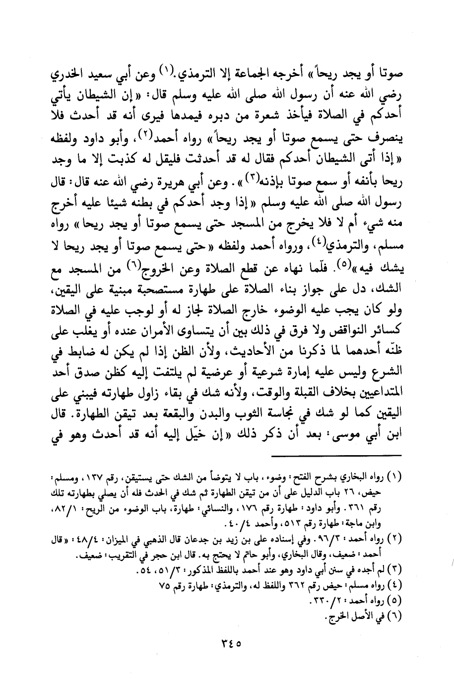 صَوْتًا أَوْ يَجِدَ رِيحًا» " أَخْرَجَهُ الْجَمَاعَةُ إِلَّا التِّرْمِذِيَّ. وَعَنْ أَبِي سَعِيدٍ الْخُدْرِيِّ - رَضِيَ اللَّهُ عَنْهُ - أَنَّ رَسُولَ اللَّهِ - صَلَّى اللَّهُ عَلَيْهِ وَسَلَّمَ - قَالَ: " «إِنَّ الشَّيْطَانَ يَأْتِي أَحَدَكُمْ فِي الصَّلَاةِ، فَيَأْخُذُ شَعْرَةً مِنْ دُبُرِهِ، فَيَمُدُّهَا، فَيَرَى أَنَّهُ قَدْ أَحْدَثَ، فَلَا يَنْصَرِفْ حَتَّى يَسْمَعَ صَوْتًا أَوْ يَجِدَ رِيحًا» " رَوَاهُ أَحْمَدُ، وَأَبُو دَاوُدَ وَلَفْظُهُ: " «إِذَا أَتَى الشَّيْطَانُ أَحَدَكُمْ فَقَالَ لَهُ: قَدْ أَحْدَثْتَ، فَلْيَقُلْ لَهُ: كَذَبْتَ، إِلَّا مَا وَجَدَ رِيحًا بِأَنْفِهِ أَوْ سَمِعَ صَوْتًا بِأُذُنِهِ» " وَعَنْ أَبِي هُرَيْرَةَ - رَضِيَ اللَّهُ عَنْهُ - قَالَ: قَالَ رَسُولُ اللَّهِ - صَلَّى اللَّهُ عَلَيْهِ وَسَلَّمَ -: " «إِذَا وَجَدَ أَحَدُكُمْ فِي بَطْنِهِ شَيْئًا عَلَيْهِ أَخَرَجَ مِنْهُ شَيْءٌ أَمْ لَا، فَلَا يَخْرُجْ مِنَ الْمَسْجِدِ حَتَّى يَسْمَعَ صَوْتًا أَوْ يَجِدَ رِيحًا» " رَوَاهُ مُسْلِمٌ وَالتِّرْمِذِيُّ، وَرَوَاهُ أَحْمَدُ وَلَفْظُهُ: " «حَتَّى يَسْمَعَ صَوْتًا أَوْ يَجِدَ رِيحًا لَا يَشُكُّ فِيهِ» ". فَلَمَّا نَهَاهُ عَنْ قَطْعِ الصَّلَاةِ وَعَنِ الْخُرُوجِ مِنَ الْمَسْجِدِ مَعَ الشَّكِّ دَلَّ عَلَى جَوَازِ بِنَاءِ الصَّلَاةِ عَلَى طَهَارَةٍ مُسْتَصْحَبَةٍ مَبْنِيَّةٍ عَلَى الْيَقِينِ، وَلَوْ كَانَ يَجِبُ عَلَيْهِ الْوُضُوءُ خَارِجَ الصَّلَاةِ لَجَازَ لَهُ، أَوْ لَوَجَبَ عَلَيْهِ فِي الصَّلَاةِ كَسَائِرِ النَّوَاقِضِ، وَلَا فَرْقَ فِي ذَلِكَ بَيْنَ أَنْ يَتَسَاوَىَ الْأَمْرَانِ عِنْدَهُ أَوْ يَغْلِبَ عَلَى ظَنِّهِ أَحَدُهُمَا لِمَا ذَكَرْنَا مِنَ الْأَحَادِيثِ، وَلِأَنَّ الظَّنَّ إِذَا لَمْ يَكُنْ لَهُ ضَابِطٌ فِي الشَّرْعِ، وَلَيْسَ عَلَيْهِ إِمَارَةٌ شَرْعِيَّةٌ أَوْ عَرَضِيَّةٌ لَمْ يُلْتَفَتْ إِلَيْهِ، كَظَنِّ صِدْقِ أَحَدِ الْمُتَدَاعِيَيْنِ، بِخِلَافِ الْقِبْلَةِ وَالْوَقْتِ، وَلِأَنَّهُ شَكَّ فِي بَقَاءِ زَاوَلَ طَهَارَتِهِ، فَيَبْنِي عَلَى الْيَقِينِ، كَمَا لَوْ شَكَّ فِي نَجَاسَةِ الثَّوْبِ وَالْبَدَنِ وَالْبُقْعَةِ بَعْدَ تَيَقُّنِ الطَّهَارَةِ، قَالَ ابْنُ أَبِي مُوسَى بَعْدَ أَنْ ذَكَرَ ذَلِكَ: " إِنْ خُيِّلَ إِلَيْهِ أَنَّهُ قَدْ أَحْدَثَ وَهُوَ فِي