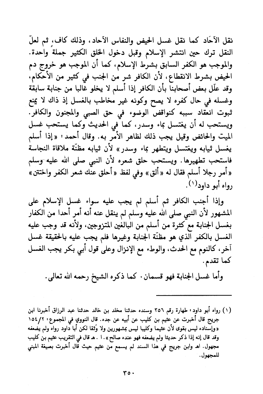 نَقَلَ الْآحَادُ كَمَا نَقَلَ غُسْلَ الْحَيْضِ وَالنِّفَاسِ الْآحَادُ، وَذَلِكَ كَافٍ، ثُمَّ لَعَلَّ النَّقْلَ تُرِكَ حِينَ انْتَشَرَ الْإِسْلَامُ وَقَبْلَ دُخُولِ الْخَلْقِ الْكَثِيرِ جُمْلَةً وَاحِدَةً، وَالْمُوجِبُ هُوَ الْكُفْرُ السَّابِقُ بِشَرْطِ الْإِسْلَامِ، كَمَا أَنَّ الْمُوجِبَ هُوَ خُرُوجُ دَمِ الْحَيْضِ بِشَرْطِ الِانْقِطَاعِ؛ لِأَنَّ الْكَافِرَ شَرٌّ مِنَ الْجُنُبِ فِي كَثِيرٍ مِنَ الْأَحْكَامِ، وَقَدْ عَلَّلَ بَعْضُ أَصْحَابِنَا بِأَنَّ الْكَافِرَ إِذَا أَسْلَمَ لَا يَخْلُو غَالِبًا مِنْ جَنَابَةٍ سَابِقَةٍ، وَغُسْلُهُ فِي حَالِ كُفْرِهِ لَا يَصِحُّ، وَكَوْنُهُ غَيْرَ مُخَاطَبٍ بِالْغُسْلِ إِذْ ذَاكَ لَا يَمْنَعُ ثُبُوتَ انْعِقَادِ سَبَبِهِ كَنَوَاقِضِ الْوُضُوءِ فِي حَقِّ الصَّبِيِّ وَالْمَجْنُونِ وَالْكَافِرِ، وَيُسْتَحَبُّ لَهُ أَنْ يَغْتَسِلَ بِمَاءٍ وَسِدْرٍ كَمَا فِي الْحَدِيثِ، وَكَمَا يُسْتَحَبُّ غُسْلُ الْمَيِّتِ وَالْحَائِضِ، وَقِيلَ: يَجِبُ ذَلِكَ لِظَاهِرِ الْأَمْرِ بِهِ، وَقَالَ أَحْمَدُ: " إِذَا أَسْلَمَ يَغْسِلُ ثِيَابَهُ، وَيَغْتَسِلُ وَيَتَطَهَّرُ بِمَاءٍ وَسِدْرٍ "؛ لِأَنَّ ثِيَابَهُ مَظِنَّةُ مُلَاقَاةِ النَّجَاسَةِ، فَاسْتُحِبَّ تَطْهِيرُهَا، وَيُسْتَحَبُّ حَلْقُ شَعْرِهِ؛ لِأَنَّ النَّبِيَّ - صَلَّى اللَّهُ عَلَيْهِ وَسَلَّمَ - «أَمَرَ رَجُلًا أَسْلَمَ فَقَالَ لَهُ: " أَلْقِ " وَفِي لَفْظٍ: " احْلِقْ عَنْكَ شَعْرَ الْكُفْرِ وَاخْتَتِنْ» " رَوَاهُ أَبُو دَاوُدَ.