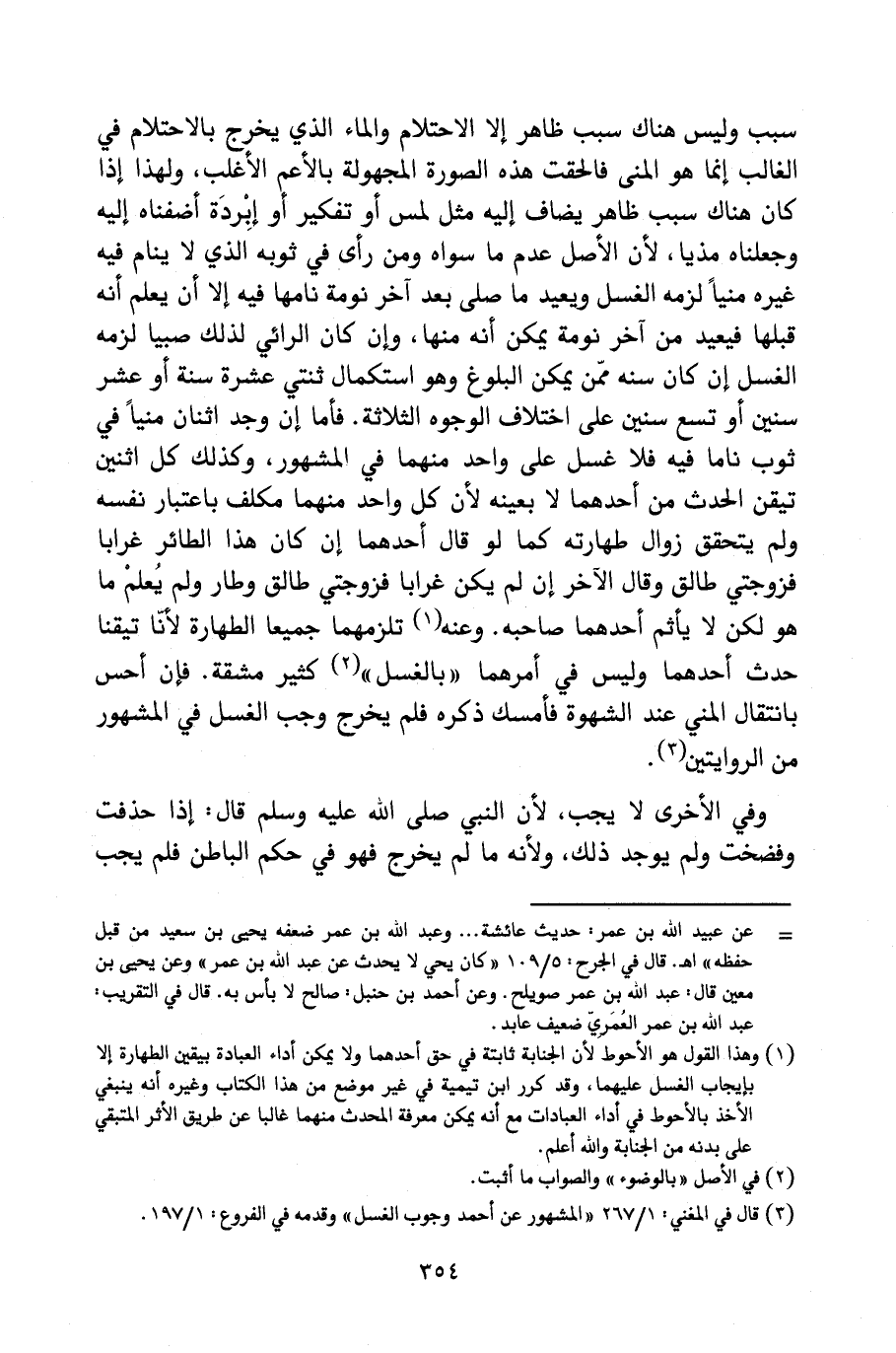 سَبَبٍ، وَلَيْسَ هُنَاكَ سَبَبٌ ظَاهِرٌ إِلَّا الِاحْتِلَامَ، وَالْمَاءُ الَّذِي يَخْرُجُ بِالِاحْتِلَامِ فِي الْغَالِبِ إِنَّمَا هُوَ الْمَنِيُّ، فَأُلْحِقَتْ هَذِهِ الصُّورَةُ الْمَجْهُولَةُ بِالْأَعَمِّ الْأَغْلَبِ؛ وَلِهَذَا إِذَا كَانَ هُنَاكَ سَبَبٌ ظَاهِرٌ يُضَافُ إِلَيْهِ مِثْلَ لَمْسٍ أَوْ تَفْكِيرٍ أَوْ إِبْرِدَةٍ، أَضَفْنَاهُ إِلَيْهِ، وَجَعَلْنَاهُ مَذْيًا؛ لِأَنَّ الْأَصْلَ عَدَمُ مَا سِوَاهُ، وَمَنْ رَأَى فِي ثَوْبِهِ الَّذِي لَا يَنَامُ فِيهِ غَيْرُهُ مَنِيًّا لَزِمَهُ الْغُسْلُ، وَيُعِيدُ مَا صَلَّى بَعْدَ آخِرِ نَوْمَةٍ نَامَهَا فِيهِ، إِلَّا أَنْ يَعْلَمَ أَنَّهُ قَبْلَهَا، فَيُعِيدُ مِنْ آخِرِ نَوْمَةٍ يُمْكِنُ أَنَّهُ مِنْهَا، وَإِنْ كَانَ الرَّائِي لِذَلِكَ صَبِيًّا، لَزِمَهُ الْغُسْلُ إِنْ كَانَ سِنُّهُ مِمَّنْ يُمْكِنُ الْبُلُوغُ وَهُوَ اسْتِكْمَالُ ثِنْتَيْ عَشْرَةَ سَنَةً أَوْ عَشْرِ سِنِينَ أَوْ تِسْعِ سِنِينَ، عَلَى اخْتِلَافِ الْوُجُوهِ الثَّلَاثَةِ، فَأَمَّا إِنْ وَجَدَ اثْنَانِ مَنِيًّا فِي ثَوْبٍ نَامَا فِيهِ، فَلَا غُسْلَ عَلَى وَاحِدٍ مِنْهُمَا فِي الْمَشْهُورِ، وَكَذَلِكَ كُلُّ اثْنَيْنِ تُيُقِّنَ الْحَدَثُ مِنْ أَحَدِهِمَا لَا بِعَيْنِهِ؛ لِأَنَّ كُلَّ وَاحِدٍ مِنْهُمَا مُكَلَّفٌ بِاعْتِبَارِ نَفْسِهِ، وَلَمْ يَتَحَقَّقْ زَوَالُ طَهَارَتِهِ، كَمَا لَوْ قَالَ أَحَدُهُمَا: إِنْ كَانَ هَذَا الطَّائِرُ غُرَابًا فَزَوْجَتِي طَالِقٌ، وَقَالَ الْآخَرُ: إِنْ لَمْ يَكُنْ غُرَابًا فَزَوْجَتِي طَالِقٌ، وَطَارَ وَلَمْ يُعْلَمْ مَا هُوَ، لَكِنْ لَا يُأَثِّمُ أَحَدُهُمَا صَاحِبَهُ. وَعَنْهُ: تَلْزَمُهُمَا جَمِيعًا الطَّهَارَةُ؛ لِأَنَّهُمَا تَيَقَّنَا حَدَثَ أَحَدِهِمَا، وَلَيْسَ فِي أَمْرِهِمَا " بِالْغُسْلِ " كَثِيرُ مَشَقَّةٍ. فَإِنْ أَحَسَّ بِانْتِقَالِ الْمَنِيِّ عِنْدَ الشَّهْوَةِ فَأَمْسَكَ ذَكَرَهُ فَلَمْ يَخْرُجْ، وَجَبَ الْغُسْلُ فِي الْمَشْهُورِ مِنَ الرِّوَايَتَيْنِ.