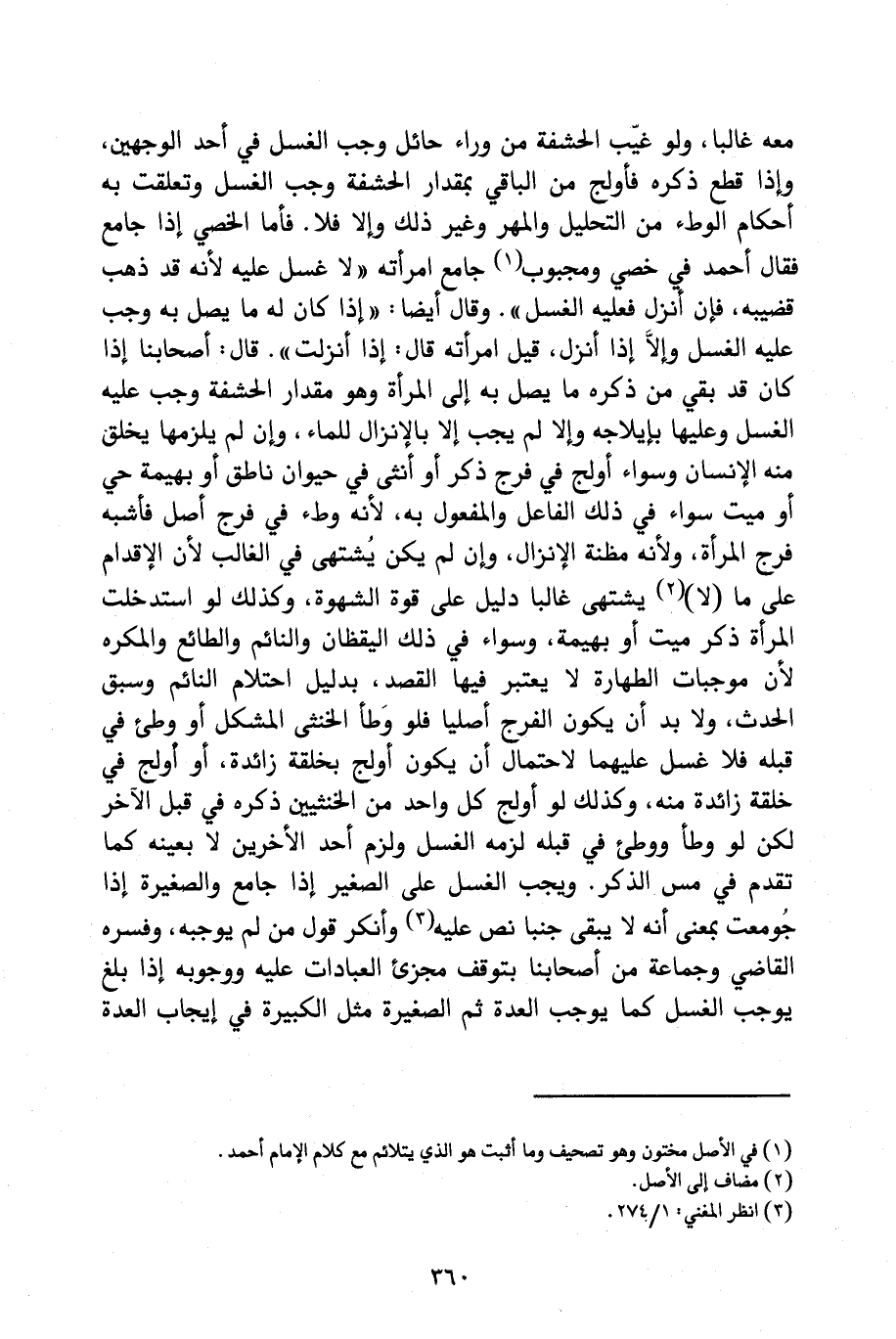 مَعَهُ غَالِبًا، وَلَوْ غَيَّبَ الْحَشَفَةَ مِنْ وَرَاءِ حَائِلٍ وَجَبَ الْغُسْلُ فِي أَحَدِ الْوَجْهَيْنِ. وَإِذَا قُطِعَ ذَكَرُهُ فَأَوْلَجَ مِنَ الْبَاقِي بِمِقْدَارِ الْحَشَفَةِ وَجَبَ الْغُسْلُ، وَتَعَلَّقَتْ بِهِ أَحْكَامُ الْوَطْءِ مِنَ التَّحْلِيلِ وَالْمَهْرِ وَغَيْرِ ذَلِكَ، وَإِلَّا فَلَا. فَأَمَّا الْخَصِيُّ إِذَا جَامَعَ فَقَالَ أَحْمَدُ فِي خَصِيٍّ وَمَجْبُوبٍ جَامَعَ امْرَأَتَهُ: " لَا غُسْلَ عَلَيْهِ؛ لِأَنَّهُ قَدْ ذَهَبَ قَضِيبُهُ، فَإِنْ أَنْزَلَ فَعَلَيْهِ الْغُسْلُ ". وَقَالَ أَيْضًا: " إِذَا كَانَ لَهُ مَا يَصِلُ بِهِ وَجَبَ عَلَيْهِ الْغُسْلُ، وَإِلَّا إِذَا أَنْزَلَ، قِيلَ: امْرَأَتُهُ، قَالَ: إِذَا أَنْزَلَتْ ". قَالَ أَصْحَابُنَا: إِذَا كَانَ قَدْ بَقِيَ مِنْ ذَكَرِهِ مَا يَصِلُ بِهِ إِلَى الْمَرْأَةِ وَهُوَ مِقْدَارُ الْحَشَفَةِ وَجَبَ عَلَيْهِ الْغُسْلُ وَعَلَيْهَا بِإِيلَاجِهِ، وَإِلَّا لَمْ يَجِبْ إِلَّا بِالْإِنْزَالِ لِلْمَاءِ، وَإِنْ لَمْ يَلْزَمْهَا يُخْلَقُ مِنْهُ الْإِنْسَانُ، وَسَوَاءٌ أَوْلَجَ فِي فَرْجِ ذَكَرٍ، أَوْ أُنْثَى، فِي حَيَوَانٍ نَاطِقٍ، أَوْ بَهِيمَةٍ، حَيٍّ أَوْ مَيِّتٍ، سَوَاءٌ فِي ذَلِكَ الْفَاعِلُ وَالْمَفْعُولُ بِهِ، لِأَنَّهُ وَطْءٌ فِي فَرْجٍ أَصْلٍ، فَأَشْبَهَ فَرْجَ الْمَرْأَةِ؛ وَلِأَنَّهُ مَظِنَّةُ الْإِنْزَالِ وَإِنْ لَمْ يَكُنْ يُشْتَهَى فِي الْغَالِبِ؛ لِأَنَّ الْإِقْدَامَ عَلَى مَا (لَا) يُشْتَهَى غَالِبًا دَلِيلٌ عَلَى قُوَّةِ الشَّهْوَةِ، وَكَذَلِكَ لَوِ اسْتَدْخَلَتِ الْمَرْأَةُ ذَكَرَ مَيِّتٍ أَوْ بَهِيمَةٍ، وَسَوَاءٌ فِي ذَلِكَ الْيَقْظَانُ وَالنَّائِمُ وَالطَّائِعُ وَالْمُكْرَهُ؛ لِأَنَّ مُوجِبَاتِ الطَّهَارَةِ لَا يُعْتَبَرُ فِيهَا الْقَصْدُ، بِدَلِيلِ احْتِلَامِ النَّائِمِ وَسَبْقِ الْحَدَثِ، وَلَا بُدَّ أَنْ يَكُونَ الْفَرْجُ أَصْلِيًّا، فَلَوْ وَطَأَ الْخُنْثَى الْمُشْكِلَ أَوْ وُطِئَ فِي قُبُلِهِ فَلَا غُسْلَ عَلَيْهِمَا؛ لِاحْتِمَالِ أَنْ يَكُونَ أَوْلَجَ بِخِلْقَةٍ زَائِدَةٍ، أَوْ أَوْلَجَ فِي خِلْقَةٍ زَائِدَةٍ مِنْهُ، وَكَذَلِكَ لَوْ أَوْلَجَ كُلُّ وَاحِدٍ مِنَ الْخُنْثَيَيْنِ ذَكَرَهُ فِي قُبُلِ الْآخَرِ، لَكِنْ لَوْ وَطَأَ وَوُطِئَ فِي قُبُلِهِ لَزِمَهُ الْغُسْلُ، وَلَزِمَ أَحَدُ الْآخَرَيْنِ لَا بِعَيْنِهِ كَمَا تَقَدَّمَ فِي مَسِّ الذَّكَرِ. وَيَجِبُ الْغُسْلُ عَلَى الصَّغِيرِ إِذَا جَامَعَ، وَالصَّغِيرَةِ إِذَا جُومِعَتْ، بِمَعْنَى أَنَّهُ لَا يَبْقَى جُنُبًا، نَصَّ عَلَيْهِ، وَأَنْكَرَ قَوْلَ مَنْ لَمْ يُوجِبْهُ، وَفَسَّرَهُ الْقَاضِي وَجَمَاعَةٌ مِنْ أَصْحَابِنَا بِتَوَقُّفِ مُجْزِئِ الْعِبَادَاتِ عَلَيْهِ، وَوُجُوبُهُ إِذَا بَلَغَ يُوجِبُ الْغُسْلَ كَمَا يُوجِبُ الْعِدَّةَ، ثُمَّ الصَّغِيرَةُ مِثْلُ الْكَبِيرَةِ فِي إِيجَابِ الْعِدَّةِ