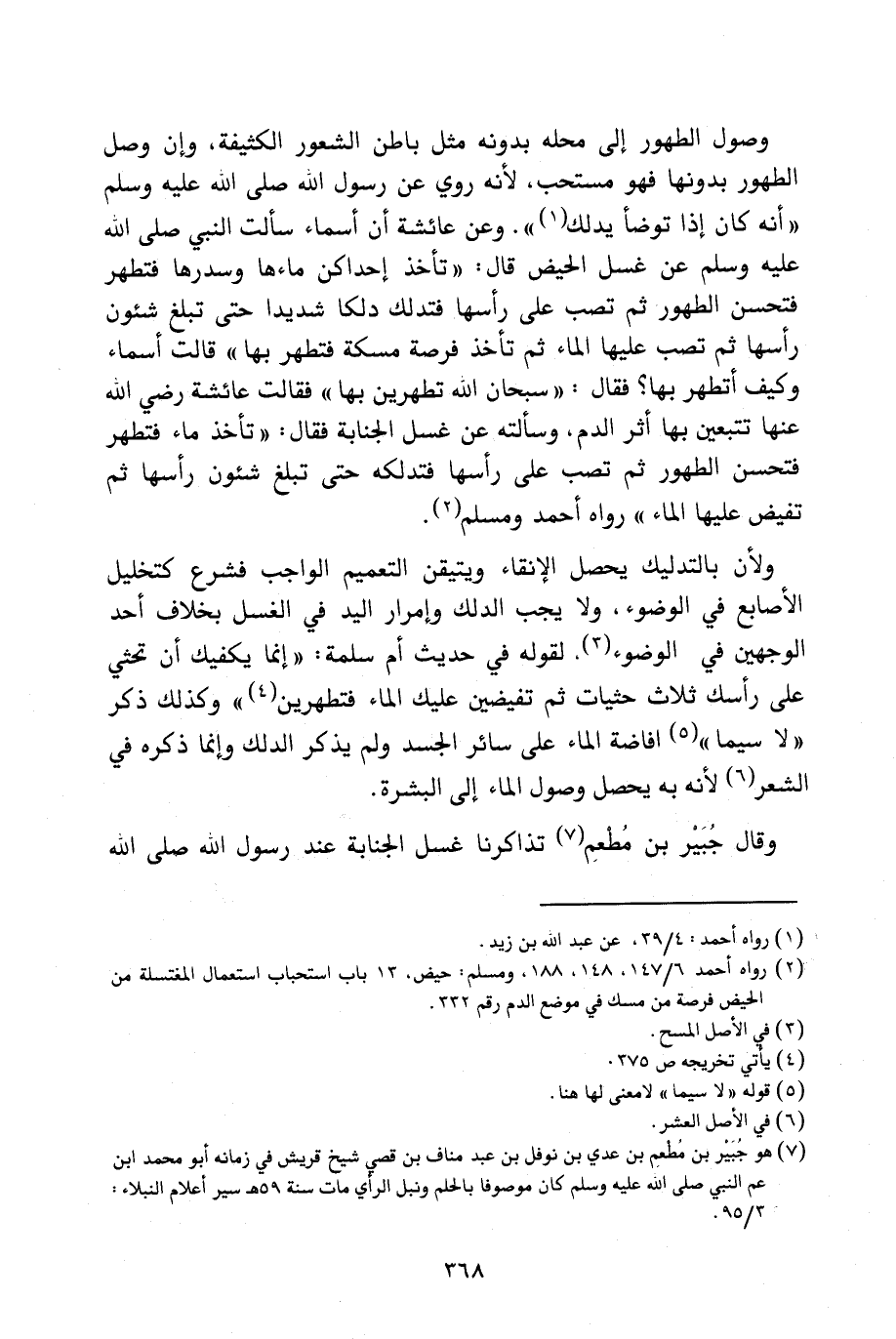 وُصُولَ الطَّهُورِ إِلَى مَحَلِّهِ بِدُونِهِ مِثْلَ بَاطِنِ الشُّعُورِ الْكَثِيفَةِ، وَإِنْ وَصَلَ الطَّهُورُ بِدُونِهَا فَهُوَ مُسْتَحَبٌّ؛ لِأَنَّهُ رُوِيَ عَنْ رَسُولِ اللَّهِ صَلَّى اللَّهُ عَلَيْهِ وَسَلَّمَ " «أَنَّهُ كَانَ إِذَا تَوَضَّأَ يُدَلِّكُ» ". وَعَنْ عَائِشَةَ «أَنَّ أَسْمَاءَ سَأَلَتِ النَّبِيَّ - صَلَّى اللَّهُ عَلَيْهِ وَسَلَّمَ - عَنْ غُسْلِ الْحَيْضِ، قَالَ: " تَأْخُذُ إِحْدَاكُنَّ مَاءَهَا وَسِدْرَهَا فَتَطْهُرُ، فَتُحْسِنُ الطَّهُورَ، ثُمَّ تَصُبُّ عَلَى رَأْسِهَا فَتُدَلِّكُ دَلْكًا شَدِيدًا حَتَّى تَبْلُغَ شُئُونَ رَأْسِهَا، ثُمَّ تَصُبُّ عَلَيْهَا الْمَاءَ، ثُمَّ تَأْخُذُ فِرْصَةً مُمَسَّكَةً فَتَطْهُرُ بِهَا " قَالَتْ أَسْمَاءُ: وَكَيْفَ أَتَطَهَّرُ بِهَا؟ فَقَالَ: " سُبْحَانَ اللَّهِ تَطْهُرِينَ بِهَا " فَقَالَتْ عَائِشَةُ - رَضِيَ اللَّهُ عَنْهَا -: تَتَّبِعِينَ بِهَا أَثَرَ الدَّمِ. وَسَأَلَتْهُ عَنْ غُسْلِ الْجَنَابَةِ فَقَالَ: " تَأْخُذُ مَاءً فَتَطْهُرُ فَتُحْسِنُ الطَّهُورَ، ثُمَّ تَصُبُّ عَلَى رَأْسِهَا فَتُدَلِّكُهُ حَتَّى تَبْلُغَ شُئُونَ رَأْسِهَا، ثُمَّ تُفِيضُ عَلَيْهَا الْمَاءَ» رَوَاهُ أَحْمَدُ وَمُسْلِمٌ.