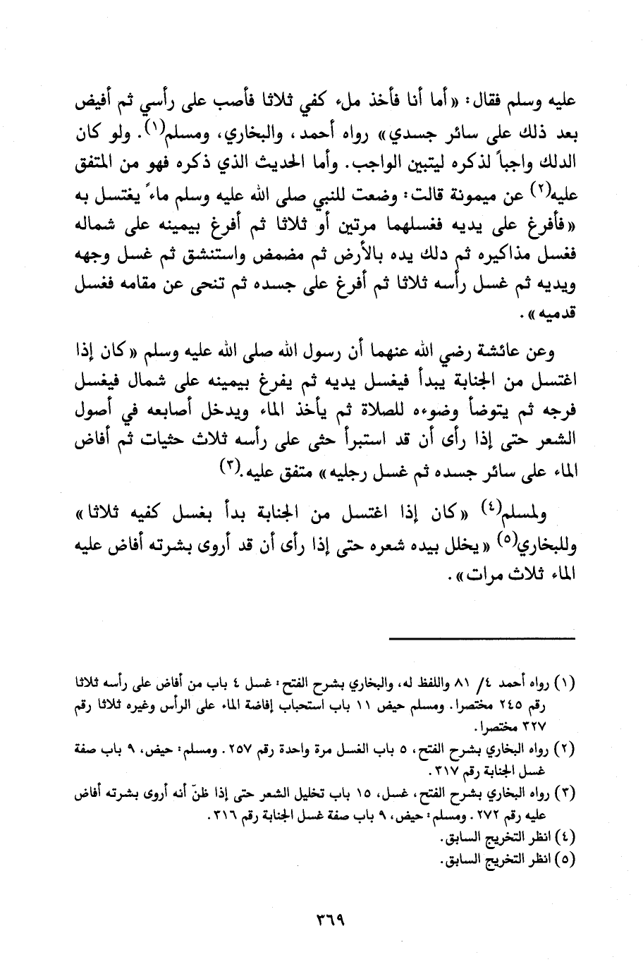عَلَيْهِ وَسَلَّمَ فَقَالَ: " «أَمَّا أَنَا فَآخُذُ مِلْءَ كَفِّي ثَلَاثًا، فَأَصُبُّ عَلَى رَأْسِي، ثُمَّ أُفِيضُ بَعْدَ ذَلِكَ عَلَى سَائِرِ جَسَدِي» " رَوَاهُ أَحْمَدُ وَالْبُخَارِيُّ وَمُسْلِمٌ. وَلَوْ كَانَ الدَّلْكُ وَاجِبًا لَذَكَرَهُ؛ لِيَتَبَيَّنَ الْوَاجِبُ. وَأَمَّا الْحَدِيثُ الَّذِي ذَكَرَهُ فَهُوَ مِنَ الْمُتَّفَقِ عَلَيْهِ عَنْ مَيْمُونَةَ قَالَتْ: " «وَضَعْتُ لِلنَّبِيِّ - صَلَّى اللَّهُ عَلَيْهِ وَسَلَّمَ - مَاءً يَغْتَسِلُ بِهِ، فَأَفْرَغَ عَلَى يَدَيْهِ فَغَسَلَهُمَا مَرَّتَيْنِ أَوْ ثَلَاثًا، ثُمَّ أَفْرَغَ بِيَمِينِهِ عَلَى شِمَالِهِ فَغَسَلَ مَذَاكِيرَهُ، ثُمَّ دَلَكَ يَدَهُ بِالْأَرْضِ، ثُمَّ مَضْمَضَ وَاسْتَنْشَقَ، ثُمَّ غَسَلَ وَجْهَهُ وَيَدَيْهِ، ثُمَّ غَسَلَ رَأْسَهُ ثَلَاثًا، ثُمَّ أَفْرَغَ عَلَى جَسَدِهِ، ثُمَّ تَنَحَّى عَنْ مَقَامِهِ فَغَسَلَ قَدَمَيْهِ» ".