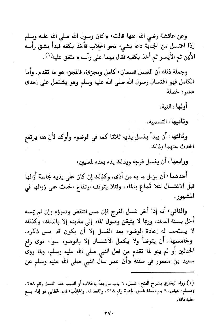 وَجُمْلَةُ ذَلِكَ أَنَّ الْغُسْلَ قِسْمَانِ: كَامِلٌ وَمُجْزِئٌ، فَالْمُجْزِئُ هُوَ مَا تَقَدَّمَ، وَأَمَّا الْكَامِلُ فَهُوَ اغْتِسَالُ رَسُولِ اللَّهِ صَلَّى اللَّهُ عَلَيْهِ وَسَلَّمَ، وَهُوَ يَشْتَمِلُ عَلَى إِحْدَى عَشْرَةَ خَصْلَةً: