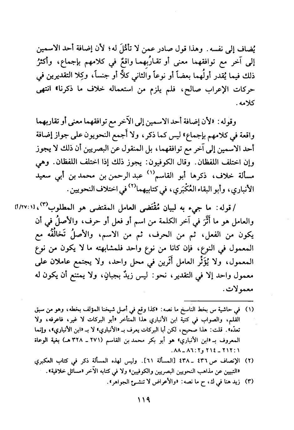 وقوله: "لأن إضافة أحد الاسمين إلي الآخر مع توافقهما معنى أو تقاربهما واقعة في كلامهم بإجماع"ليس كما ذكر، ولا أجمع النحويون على جواز إضافة أحد الاسمين إلي آخر مع توافقهما، بل المنقول عن البصريين أن ذلك لا يجوز وإن اختلف اللفظان. وقال الكوفيون: يجوز ذلك إذا اختلف اللفظان. وهي مسألة خلاف، ذكرها أبو القاسم عبد الرحمن بن محمد بن أبي سعيد الأنباري، وأبو البقاء العكبري، في كتابيهما في اختلاف النحويين.