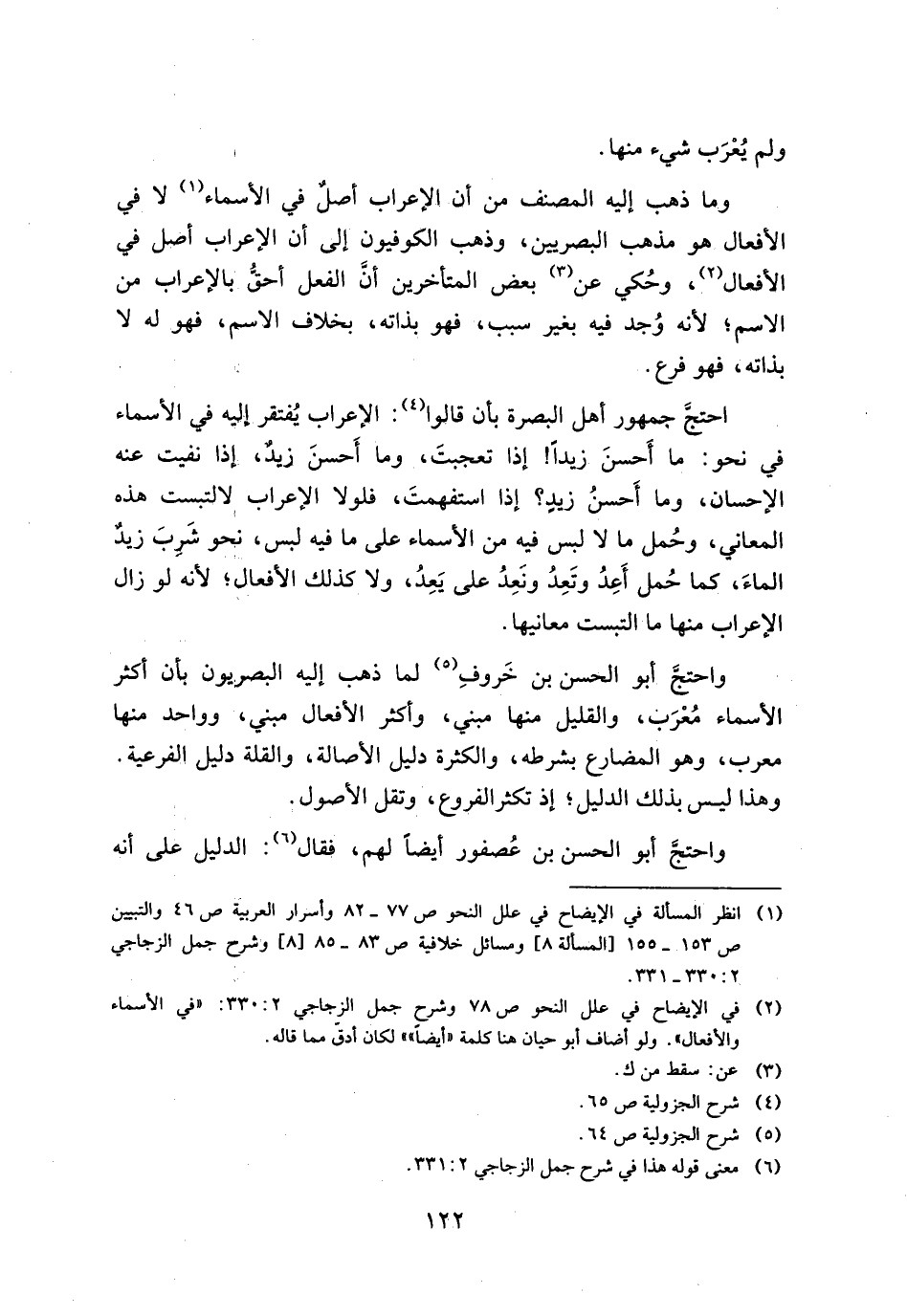 احتج جمهور أهل البصرة بأن قالوا: الإعراب يفتقر إليه في الأسماء في نحو: ما أحسن زيداً! إذا تعجبت، وما أحسن زيد، إذا نفيت عنه الإحسان، وما أحسن زيد؟ إذا استفهمت، فلولا الإعراب لالتبست هذه المعاني، وحمل ما لا لبس فيه من الأسماء على ما فيه لبس، نحو شرب زيد الماء، كما حمل أعد وتعد ونعد على يعد، ولا كذلك الأفعال؛ لأنه لو زال الإعراب منها ما التبست معانيها.