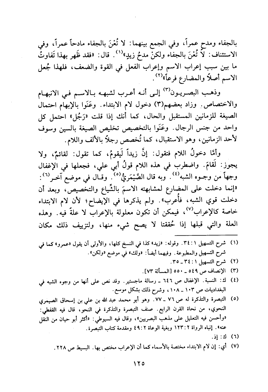 وأما دخول اللام فتقول: إن زيداً ليقوم، كما تقول: لقائم، ولا يجوز: لقام. واضطرب في هذه اللام قول أبي علي، فجعلها في الإغفال وجهاً من وجوه الشبه. وبه قال الصيمري. وقال في موضع آخر: "إنما دخلت على المضارع لمشابهته الاسم بالشياع والتخصيص، وبعد أن دخلت قوي الشبه، فأعرب". ولم يذكرها في الإيضاح؛ لأن لام الابتداء خاصة كالإعراب، فيمكن أن تكون معلولة بالإعراب لا علة فيه وهذه العلة والتي قبلها إذا حققتا لا يصح شيء منها، ولتزييف ذلك مكان