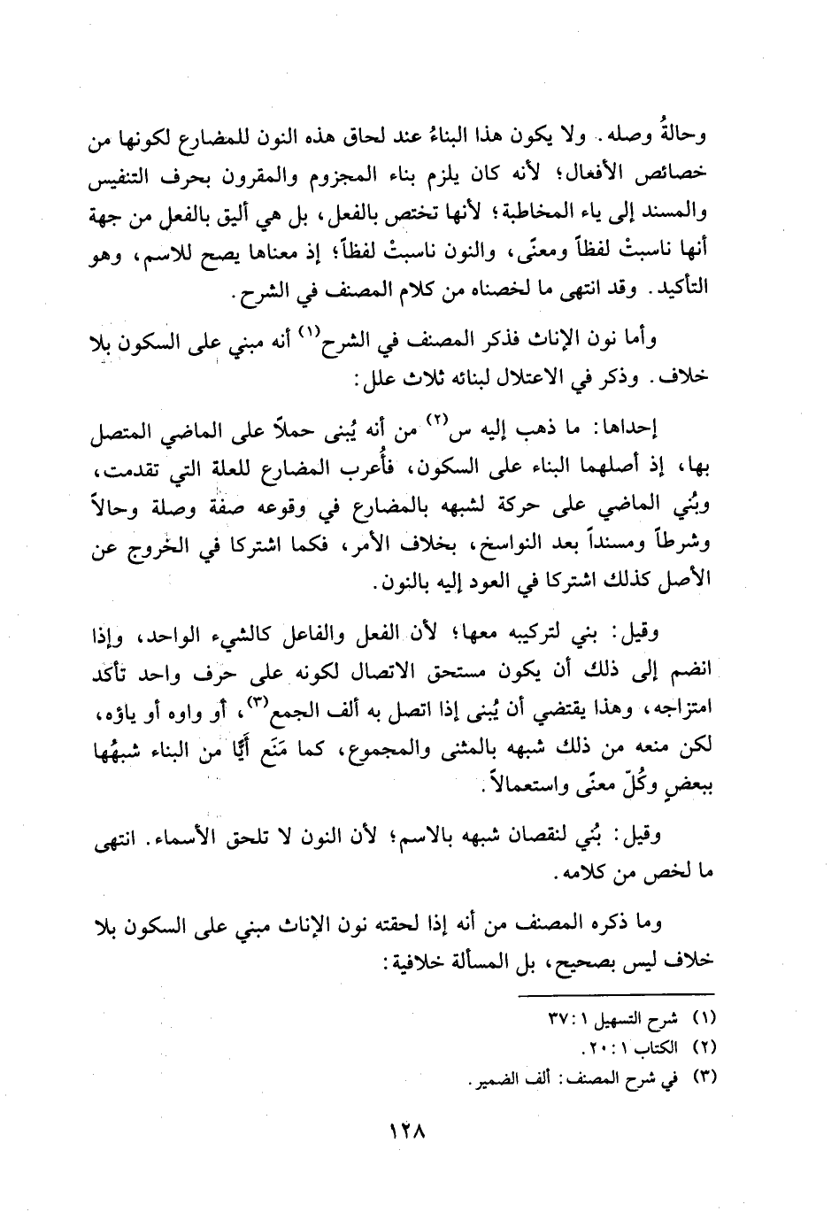 وأما نون الإناث فذكر المصنف في الشرح أنه مبني على السكون بلا خلاف. وذكر في الاعتلال لبنائه ثلاث علل: