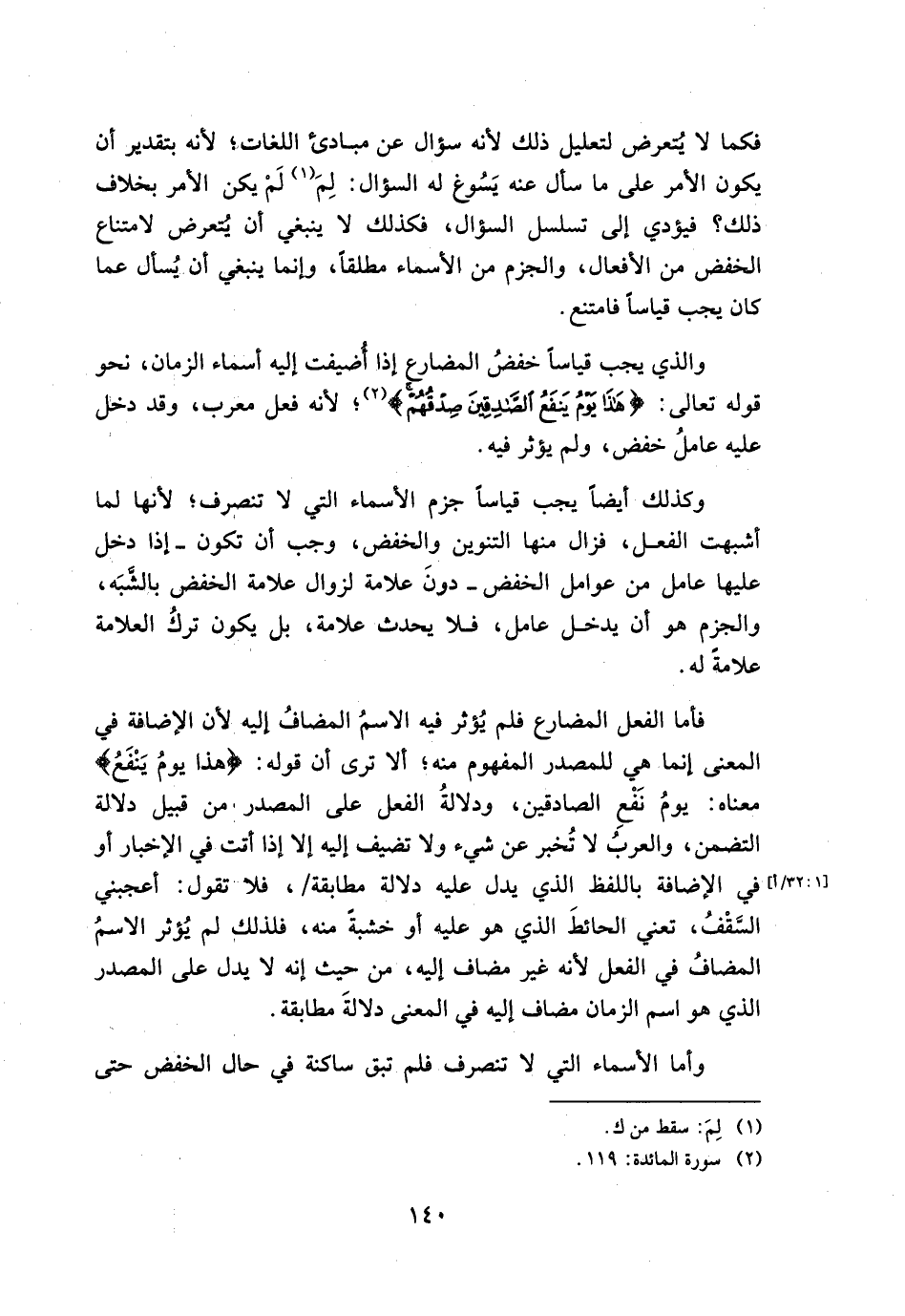 والذي يجب قياساً خفض المضارع إذا أضيفت أليه أسماء الزمان نحو قوله تعالى: {هَذَا يَوْمُ يَنفَعُ الصَّادِقِينَ صِدْقُهُمْ} لأنه فعل معرب وقد دخل عليه عامل خفض ولم يؤثر فيه.