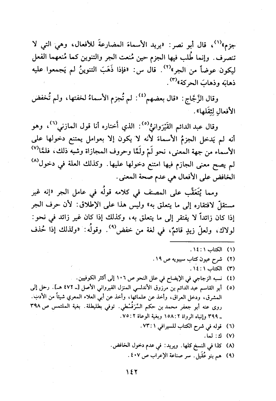 وقال عبد الدائم القيرواني: الذي أختاره أنا قول المازني وهو أنه لم يدخل الجزم الأسماء لأنه لا يكون إلا بعوامل يمتنع دخولها على الأسماء من جهة المعنى، نحو لم ولما وحروف المجازاة وشبه ذلك، فلما لم يصح معنى الجازم فيها امتنع دخولها عليها. وكذلك العلة في دخول الخافض على الأفعال هي عدم صحة المعنى.