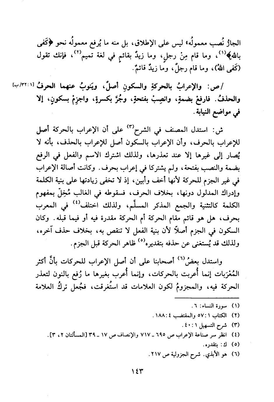 ش: استدل المصنف في الشرح على أن الإعراب بالحركة أصل للإعراب بالحرف، وأن الإعراب بالسكون أصل للإعراب بالحذف بأنه لا يصار إلى غيرها إلا عند تعذرها، ولذلك اشترك الاسم والفعل في الرفع بضمة والنصب بفتحة ولم يشتركا في إعراب بحرف. وكانت أصالة الإعراب في غير الجزم للحركة لأنها أخف وأبين، إذ لا تخفي زيادتها على بنية الكلمة وإدراك المدلول دونها، بخلاف الحرف، فسقوطه في الغالب مخل بمفهوم الكلمة كالتثنية والجمع المذكر المسلم، ولذلك اختلف في المعرب بحرف، هل هو قائم مقام الحركة أم الحركة مقدرة فيه أو فيما قبله. كان السكون في الجزم أصلاً لأن بنية الفعل لا تنقص به، بخلاف حذف آخره، ولذلك قد يستغنى عن حذفه بتقديره ظاهر الحركة قبل الجزم.