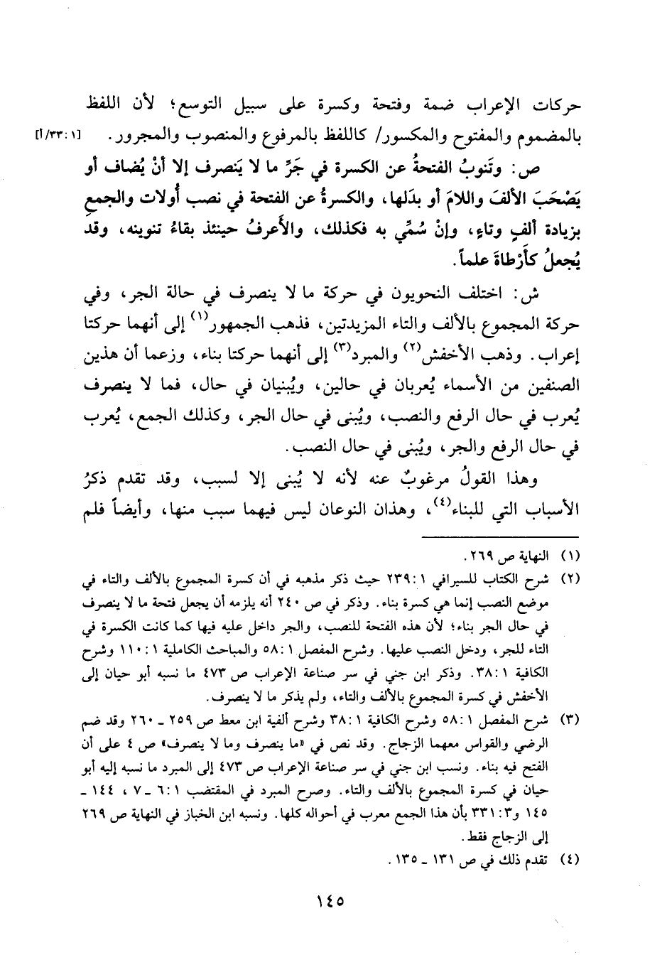 ش: اختلف النحويون في حركة مالا تنصرف في حالة الجر، وفي حركة المجموع بالألف والتاء المزبدتين، فذهب الجمهور إلى أنهما حركتا إعراب وذهب الأخفش والمبرد إلى أنهما حركتا بناء، وزعما أن هذين الصنفين من الأسماء يعربان في حالين، ويبنيان في حال فما لا ينصرف يعرب في حال الرفع والنصب وينبي في حال الجر، وكذلك الجمع ويعرب في حال الرفع والجر، ويبني في حال النصب.
