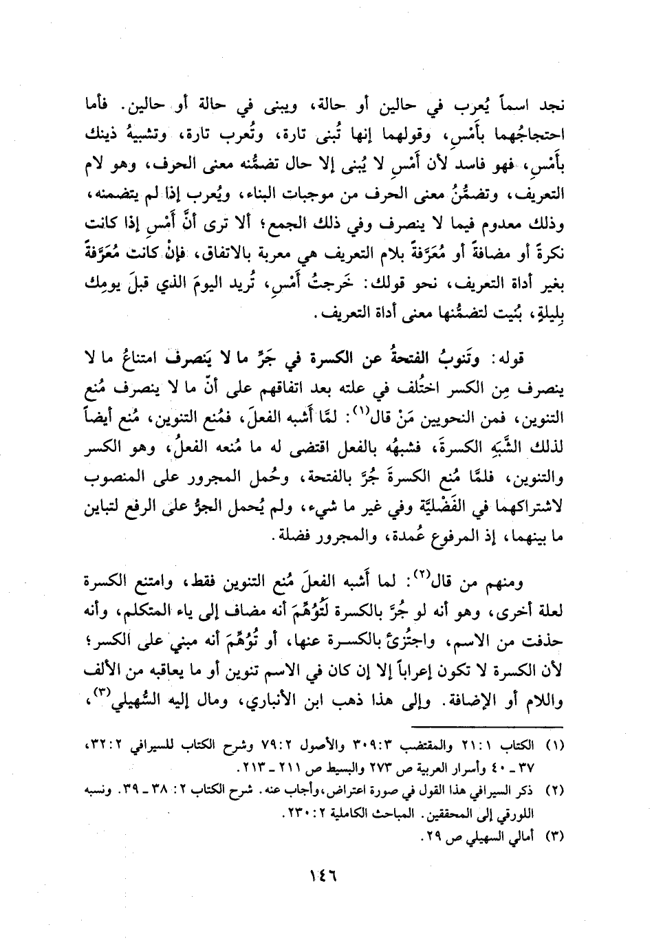 نجد اسمًا يعُرب في حالين أو حالة، ويبني في حالة أو حالين. فأما احتياجُخما بأمس، وقولهما إنها تُبني تارة، وتُعرب تارة، وتشبيهُ دينك بأمس، فهو فاسم لأن أمس لا يبني إلا حال تضمنه معني الخرف، وهو لام التعريف، وتضمن معني الحرف من موجبات البناء، ويُعرب إذا لم يتضمنه، وذلك معدوم فيما لا ينصرف وفي ذلك الجمع؛ ألا ترى أن أمس إذا كانت نكرة أو مضافة أو معرفة بلام التعريف هي معربة بالاتفاق، فإن كانت معرفة بغير أداة التعريف، نحو قولك: خرجت أمس، تريد اليوم الذي قبل يومك بليلة، ينبت لتضمنها معني أداة التعريف.
