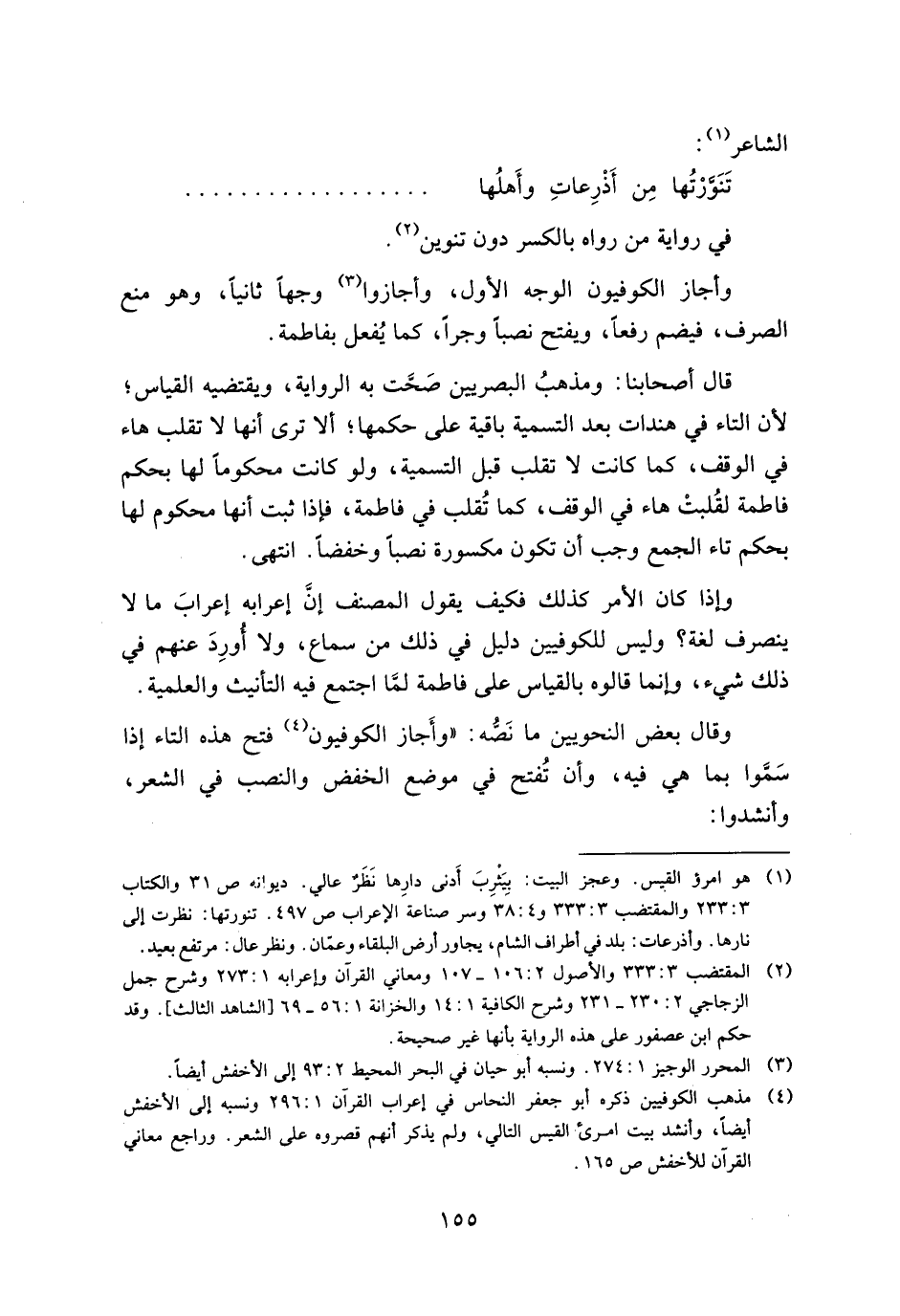 وإذا كان الأمر كذلك فكيف يقول المصنف إن إعرابه إعراب مالا ينصرف لغة؟ وليس للكوفيين دليل في ذلك من سماع ولا أورد عنهم في ذلك شيء، وإنما قالوه بالقياس على فاطمة لما اجتمع فيه التأنيث والعلمية.