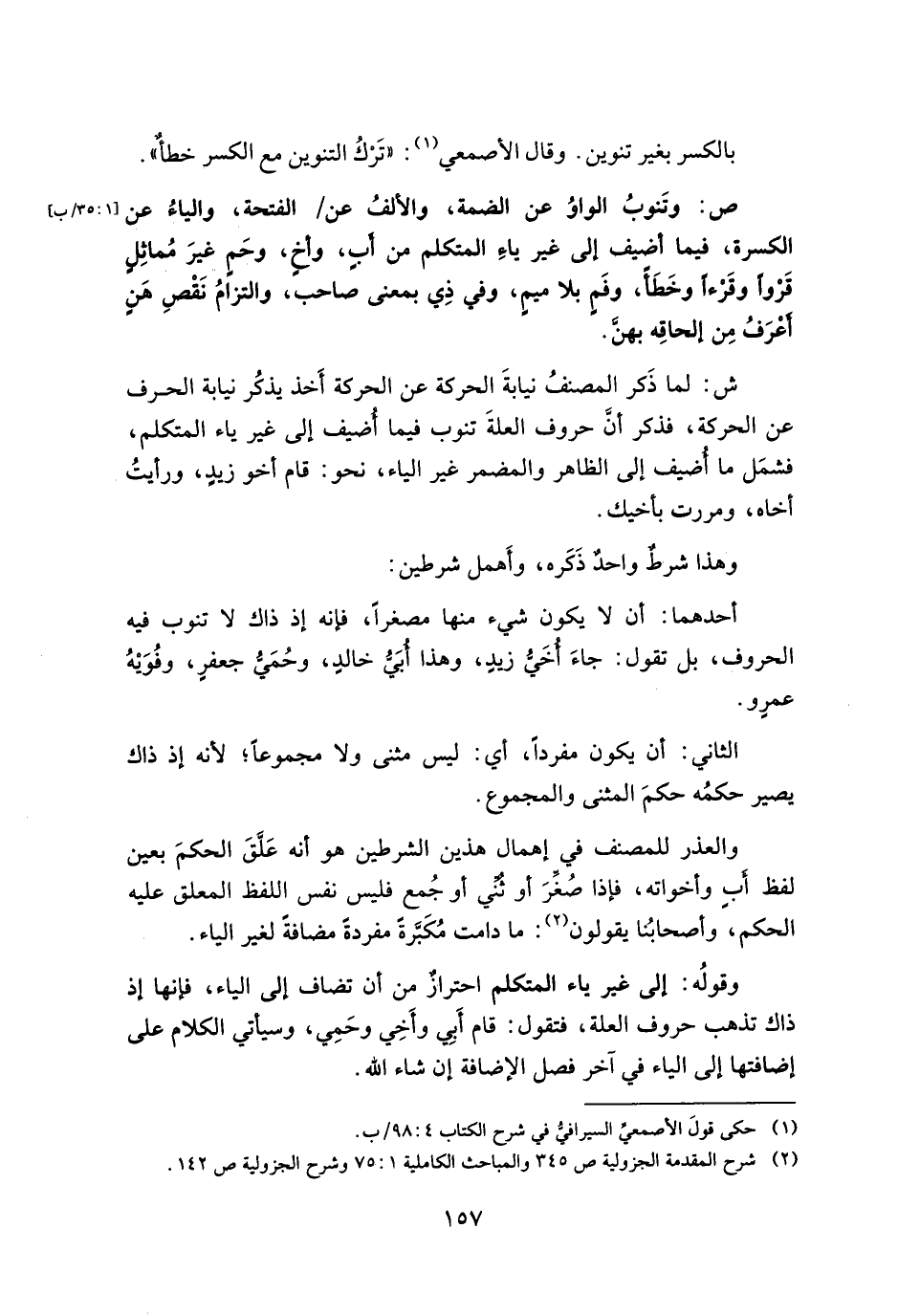 والعذر للمصنف في إهمال هذين الشرطين هو أنه علق الحكم بعين لفظ أب وأخواته، فإذا صغر أو ثني أو جمع فليس نفس اللفظ المعلق عليه الحكم، وأصحابنا يقولون: مادامت مكبرة مفردة مضافة لغير الياء